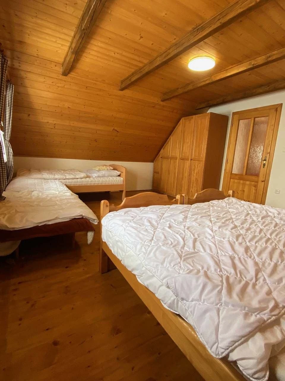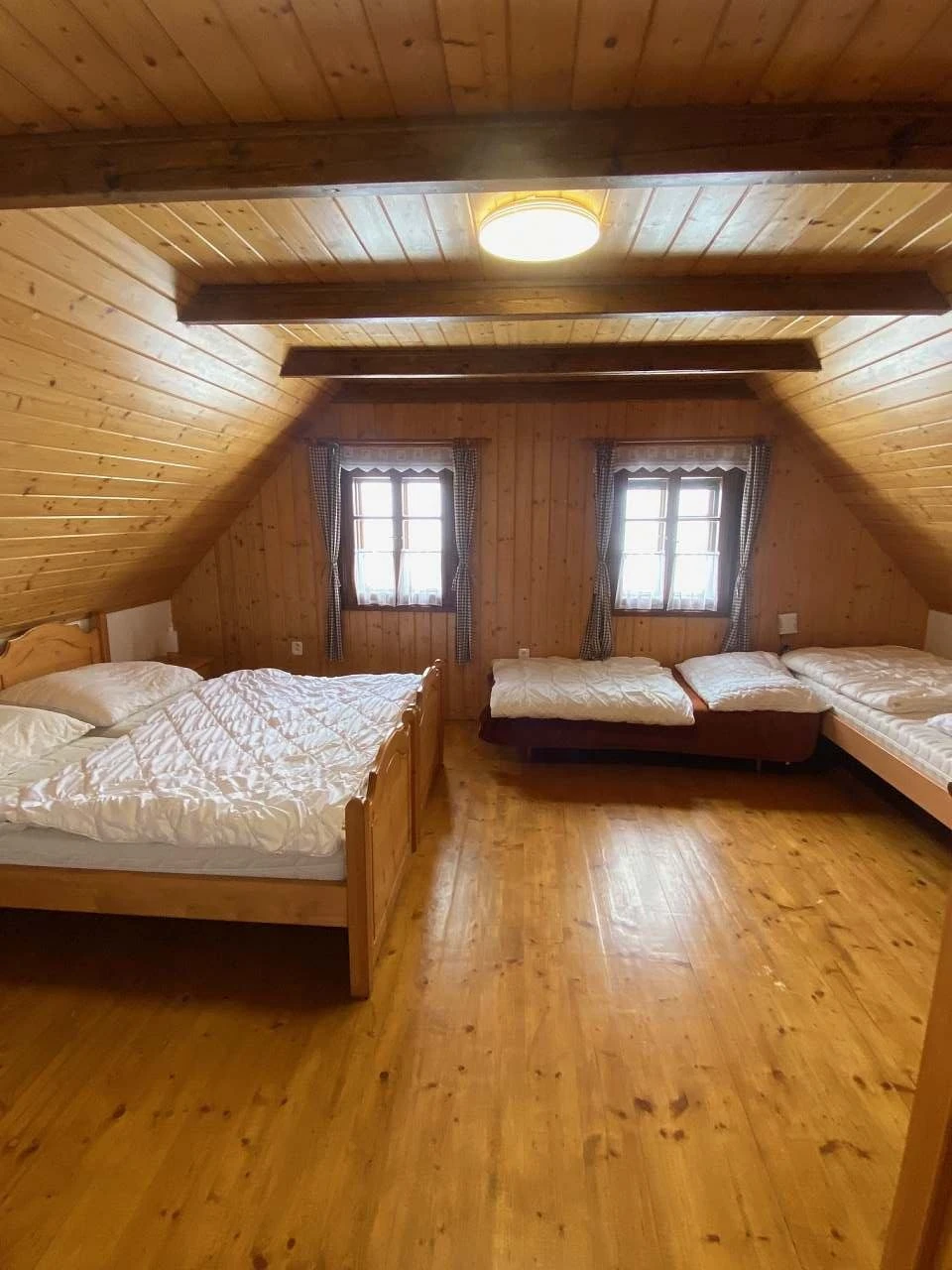 Ubytování a ložnice: Chalupa má přízemí, kde se nachází ložnice s dvoulůžkem a obývací pokoj s kuchyňským koutem. V patře jsou 2 pokoje, každý s 2 jednolůžky a možností přistýlek.