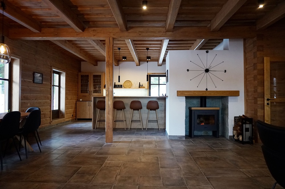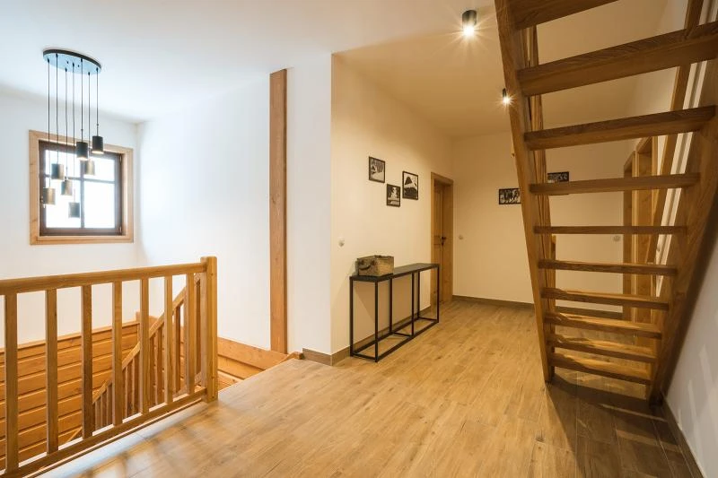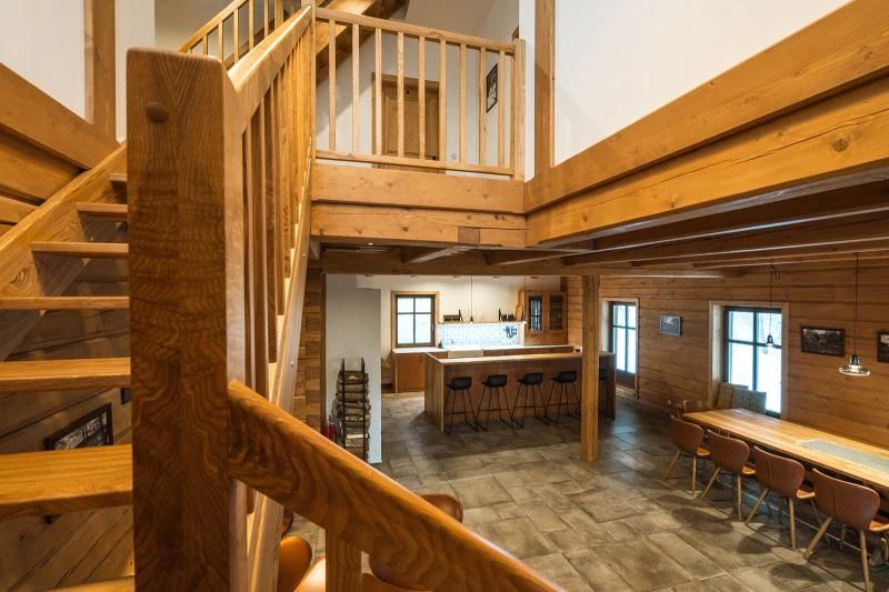 Horní roubenka je postavena tradičním způsobem z místního jedlového dřeva a nabízí moderní vybavení pro komfortní pobyt větší skupiny osob. Objekt je vhodný pro rodiny i skupiny přátel.Součástí roubenky je plně vybavená kuchyně, která umožňuje běžné i náročnější vaření. K dispozici je pečicí trouba, indukční varná deska, mikrovlnná trouba, myčka nádobí, americká lednice, kávovar na zrnkovou kávu, varná konvice, tyčový mixér, topinkovač a gril. Jídelní část tvoří velký masivní stůl s dostatečnou kapacitou pro společné stolování.Roubenka disponuje více ložnicemi s manželskými postelemi, přičemž ke každé ložnici náleží vlastní koupelna se sprchovým koutem. V přízemí se nachází další koupelna s vanou. Hostům je k dispozici pračka a sušička.Technické a další vybaveníWi-Fi připojeníTVSejfKávovarTerasaParkoviště u objektuWellness a venkovní zázemíFinská saunaOchlazovací jezírkoOhništěDětské hřištěÚložné prostoryKolárnaLyžárna