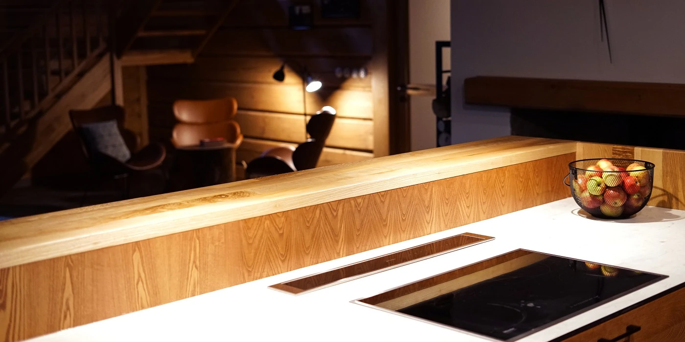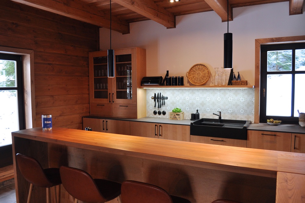 Každá roubenka disponuje plně vybavenou kuchyní určenou pro vaření pro více osob. K vybavení patří pečicí trouba, indukční varná deska, mikrovlnná trouba, myčka nádobí, americká lednice, kávovar na zrnkovou kávu, varná konvice, tyčový mixér, topinkovač a gril. Součástí jídelního prostoru je velký masivní stůl s dostatečnou kapacitou pro společné stolování.