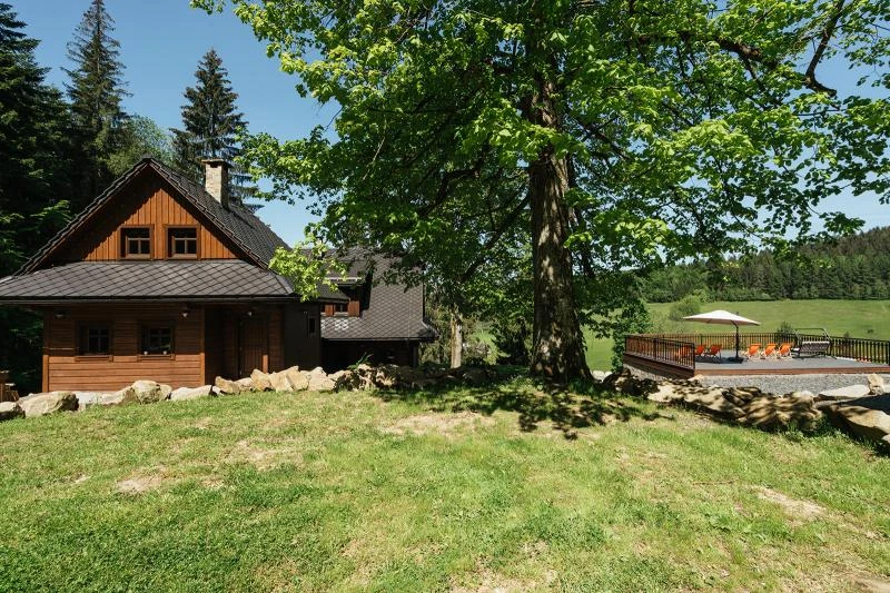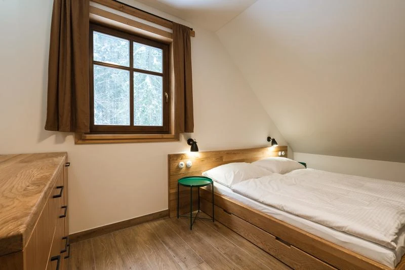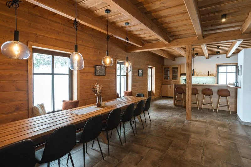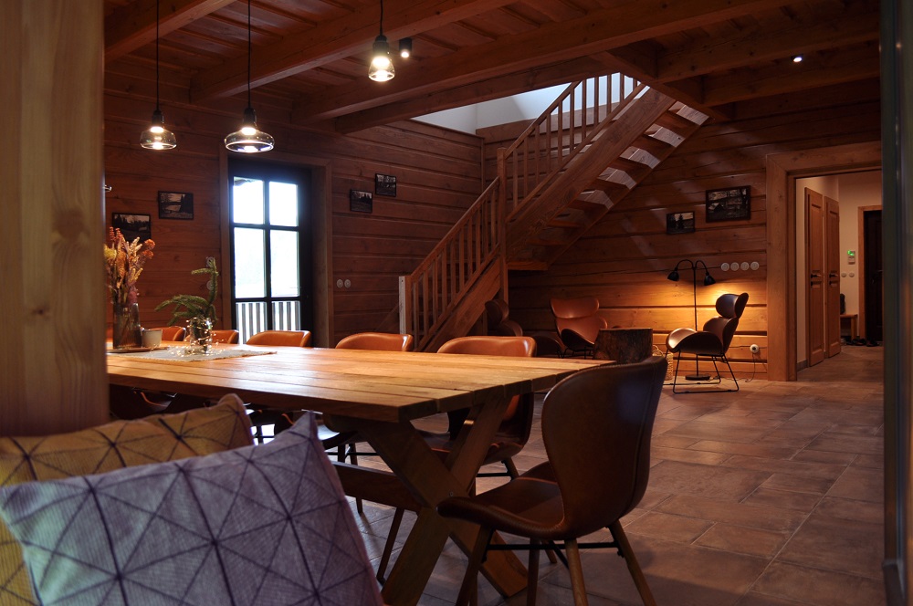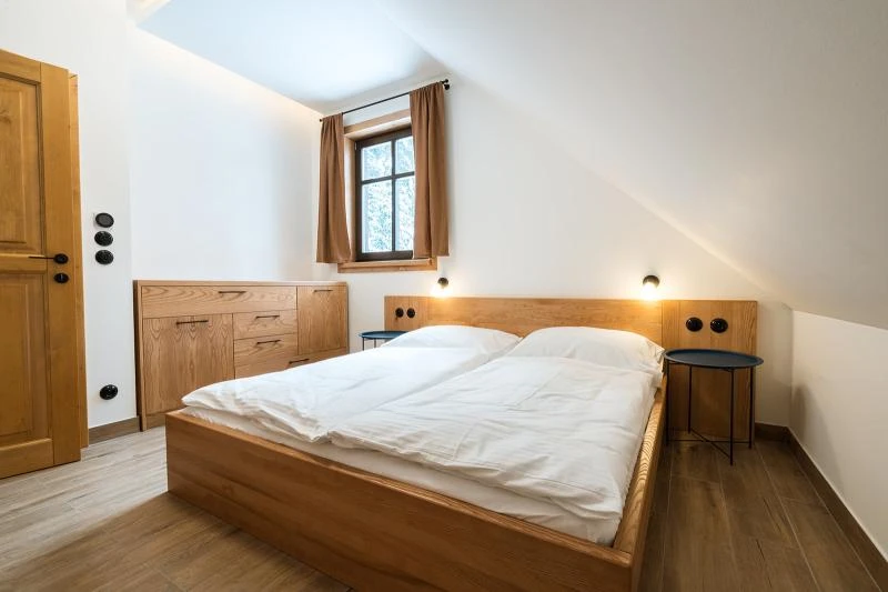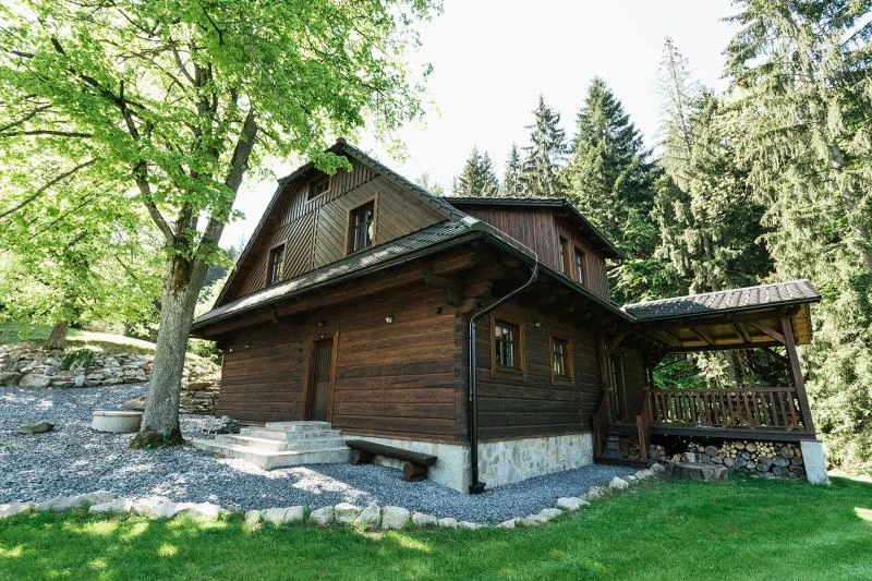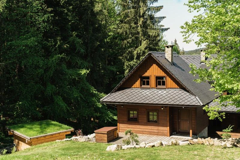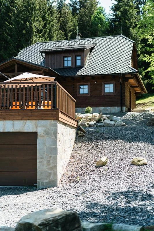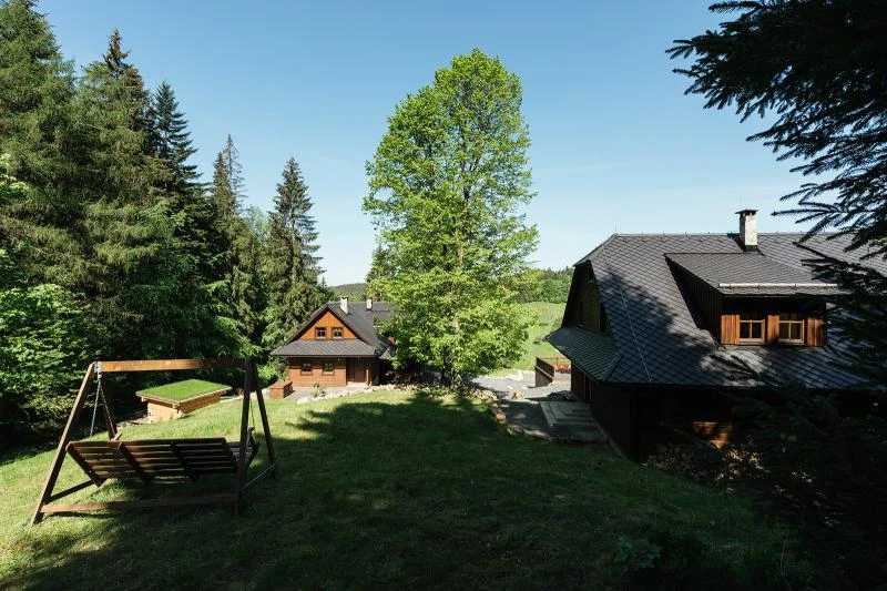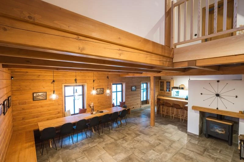 Dolní roubenka je postavena tradičním způsobem z místního jedlového dřeva a je plně přizpůsobena pro pohodlné ubytování rodin i větších skupin. Objekt kombinuje klasickou roubenou stavbu s moderním technickým zázemím.Součástí roubenky je plně vybavená kuchyně vhodná pro každodenní provoz i vaření pro více osob. K dispozici je pečicí trouba, indukční varná deska, mikrovlnná trouba, myčka nádobí, americká lednice, kávovar na zrnkovou kávu, varná konvice, tyčový mixér, topinkovač a gril. Jídelní část tvoří velký masivní stůl s dostatečnou kapacitou pro společné stolování.Roubenka nabízí ložnice s manželskými postelemi, přičemž ke každé ložnici náleží vlastní koupelna se sprchovým koutem. V přízemí se nachází samostatná koupelna s vanou. Hostům je k dispozici pračka a sušička.Technické vybaveníWi-Fi připojeníTVSejfWellness a venkovní zázemíFinská saunaOchlazovací jezírkoTerasaOhništěDětské hřištěDalší vybaveníParkoviště u objektuKolárnaLyžárna
