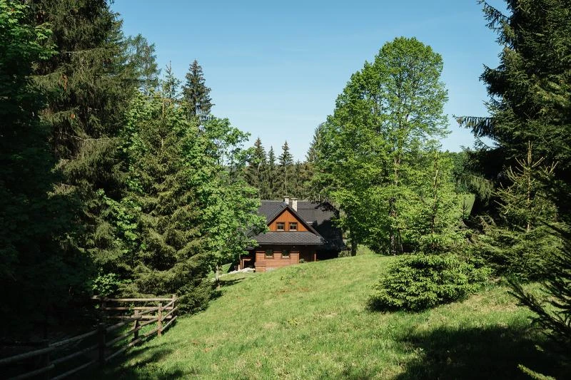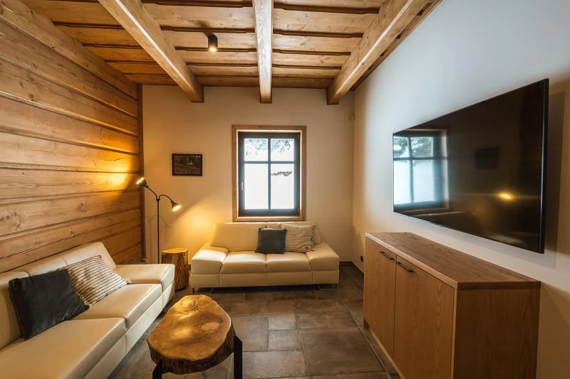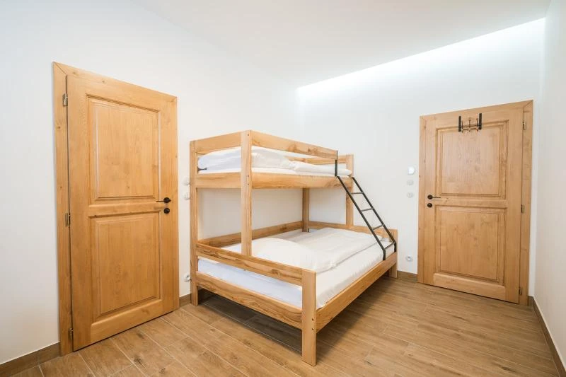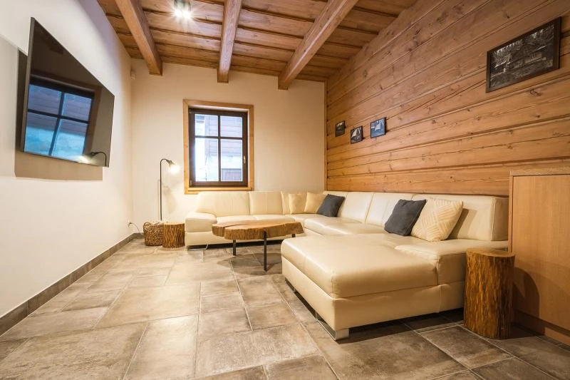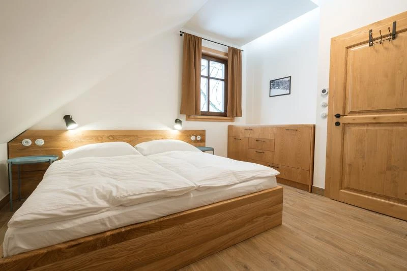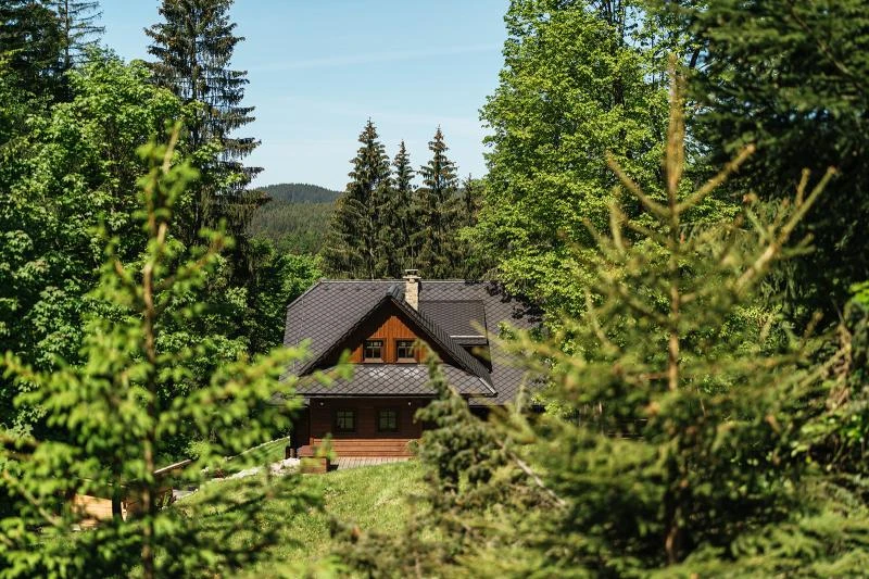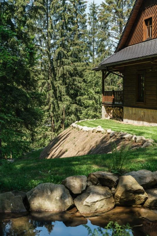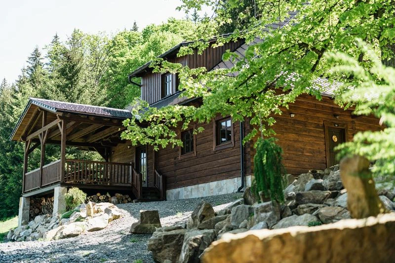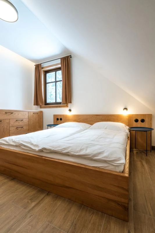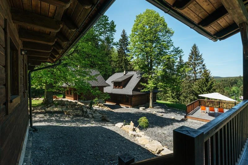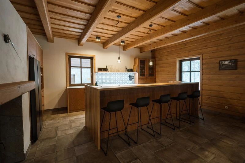 Dolní roubenka je postavena tradičním způsobem z místního jedlového dřeva a je plně přizpůsobena pro pohodlné ubytování rodin i větších skupin. Objekt kombinuje klasickou roubenou stavbu s moderním technickým zázemím.Součástí roubenky je plně vybavená kuchyně vhodná pro každodenní provoz i vaření pro více osob. K dispozici je pečicí trouba, indukční varná deska, mikrovlnná trouba, myčka nádobí, americká lednice, kávovar na zrnkovou kávu, varná konvice, tyčový mixér, topinkovač a gril. Jídelní část tvoří velký masivní stůl s dostatečnou kapacitou pro společné stolování.Roubenka nabízí ložnice s manželskými postelemi, přičemž ke každé ložnici náleží vlastní koupelna se sprchovým koutem. V přízemí se nachází samostatná koupelna s vanou. Hostům je k dispozici pračka a sušička.Technické vybaveníWi-Fi připojeníTVSejfWellness a venkovní zázemíFinská saunaOchlazovací jezírkoTerasaOhništěDětské hřištěDalší vybaveníParkoviště u objektuKolárnaLyžárna