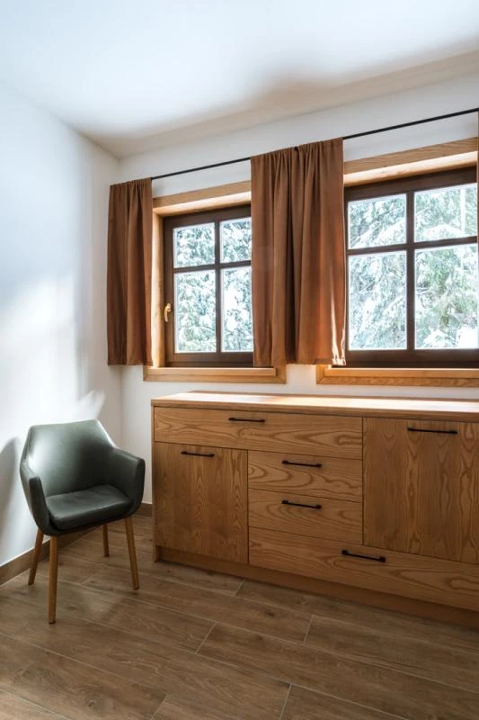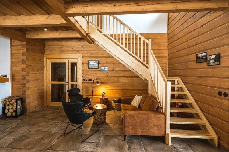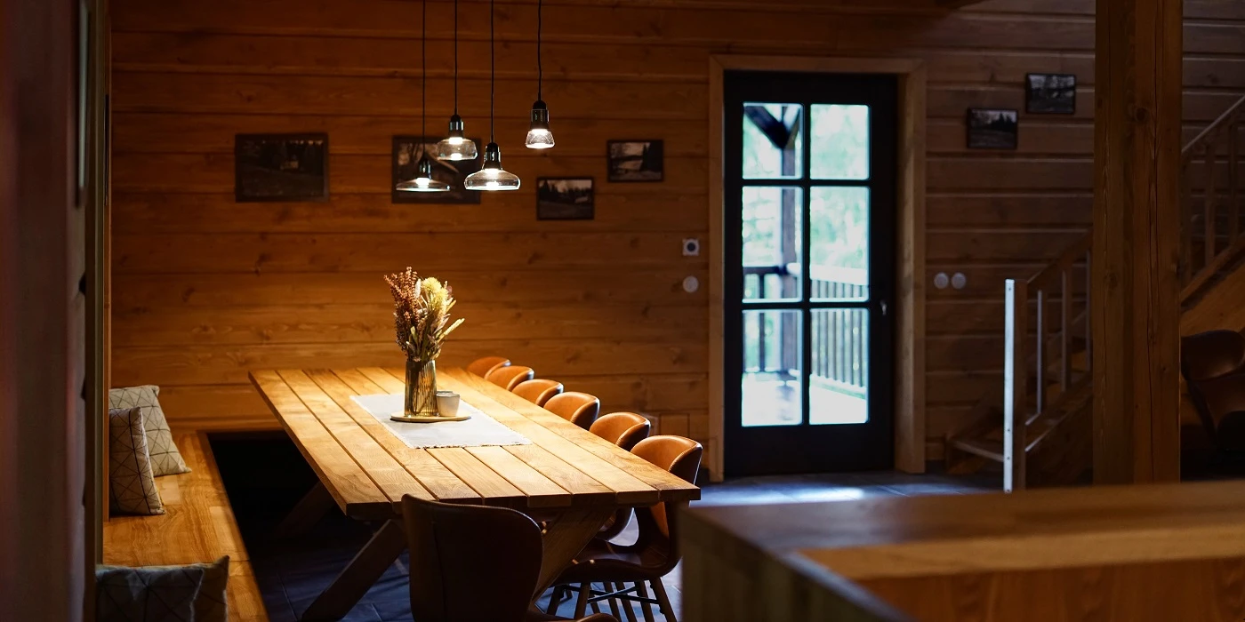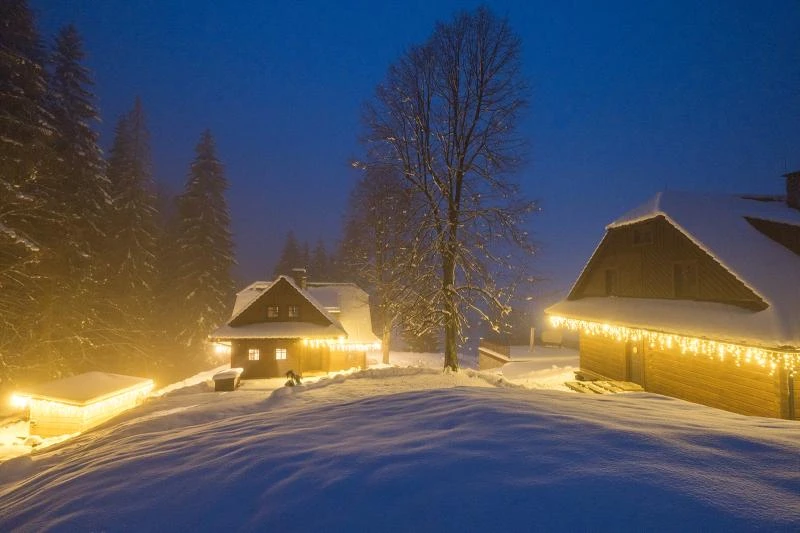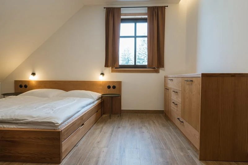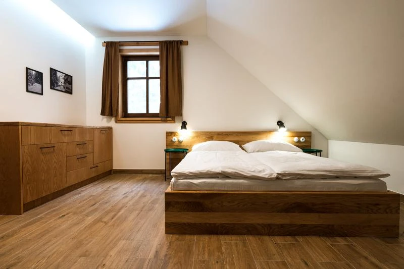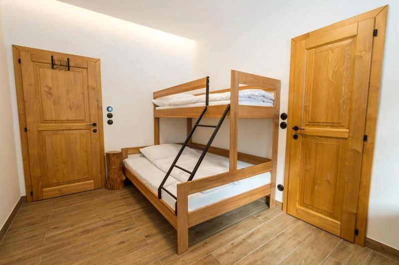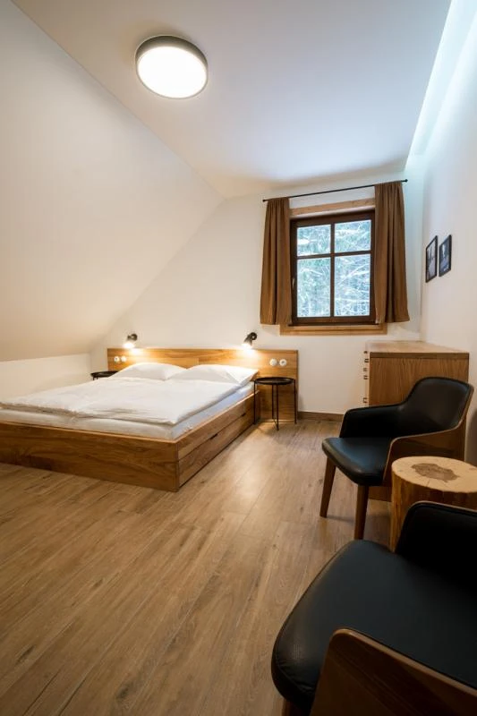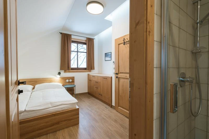 Dolní roubenka je postavena tradičním způsobem z místního jedlového dřeva a je plně přizpůsobena pro pohodlné ubytování rodin i větších skupin. Objekt kombinuje klasickou roubenou stavbu s moderním technickým zázemím.Součástí roubenky je plně vybavená kuchyně vhodná pro každodenní provoz i vaření pro více osob. K dispozici je pečicí trouba, indukční varná deska, mikrovlnná trouba, myčka nádobí, americká lednice, kávovar na zrnkovou kávu, varná konvice, tyčový mixér, topinkovač a gril. Jídelní část tvoří velký masivní stůl s dostatečnou kapacitou pro společné stolování.Roubenka nabízí ložnice s manželskými postelemi, přičemž ke každé ložnici náleží vlastní koupelna se sprchovým koutem. V přízemí se nachází samostatná koupelna s vanou. Hostům je k dispozici pračka a sušička.Technické vybaveníWi-Fi připojeníTVSejfWellness a venkovní zázemíFinská saunaOchlazovací jezírkoTerasaOhništěDětské hřištěDalší vybaveníParkoviště u objektuKolárnaLyžárna