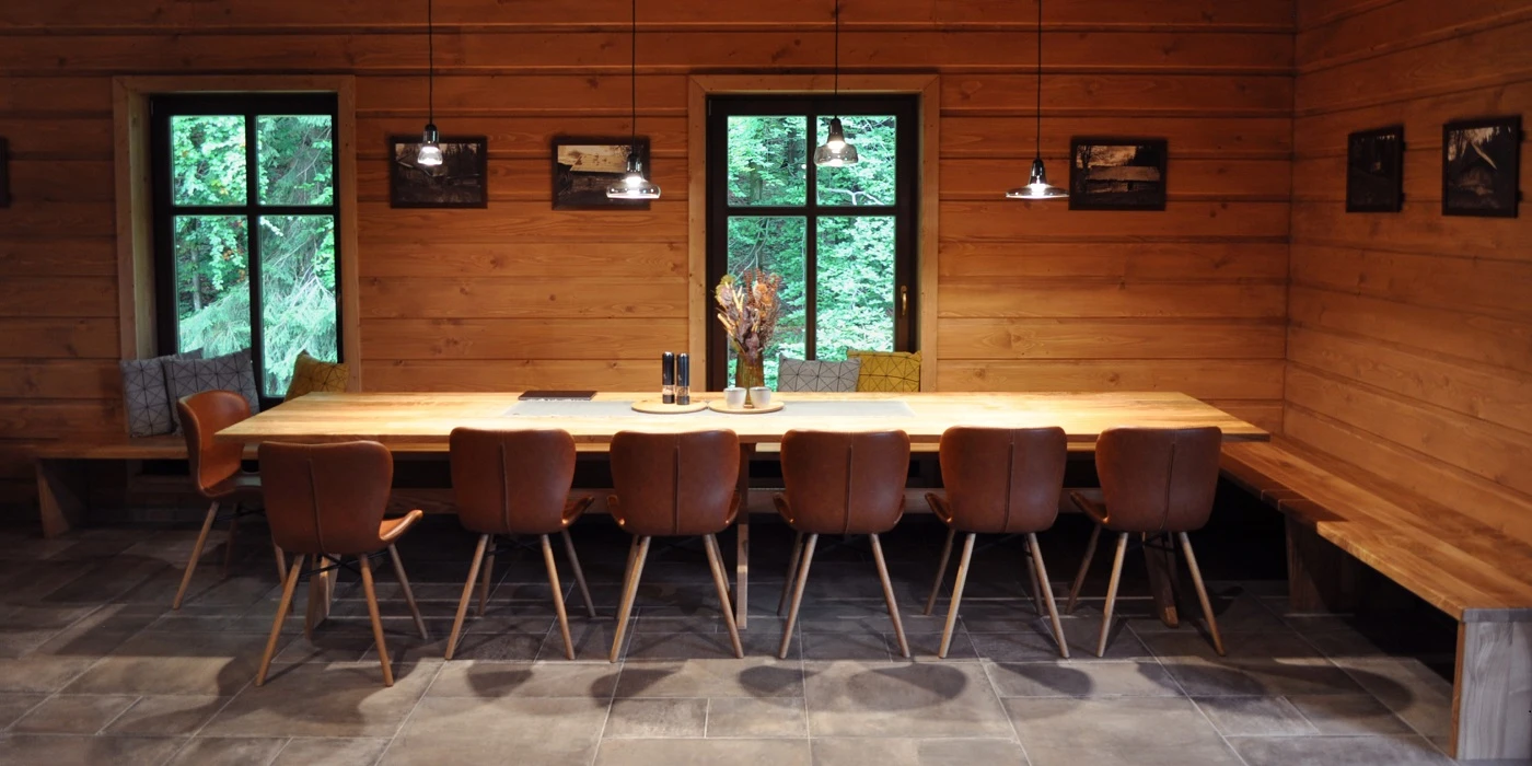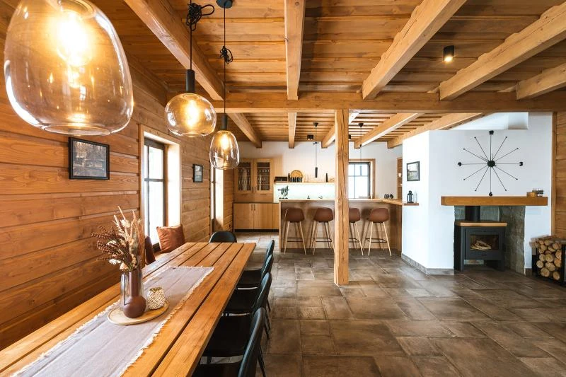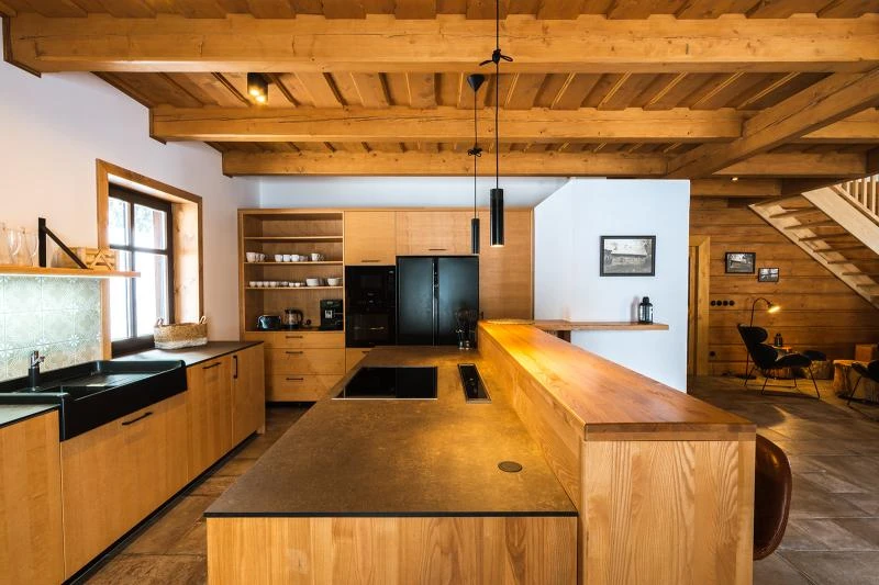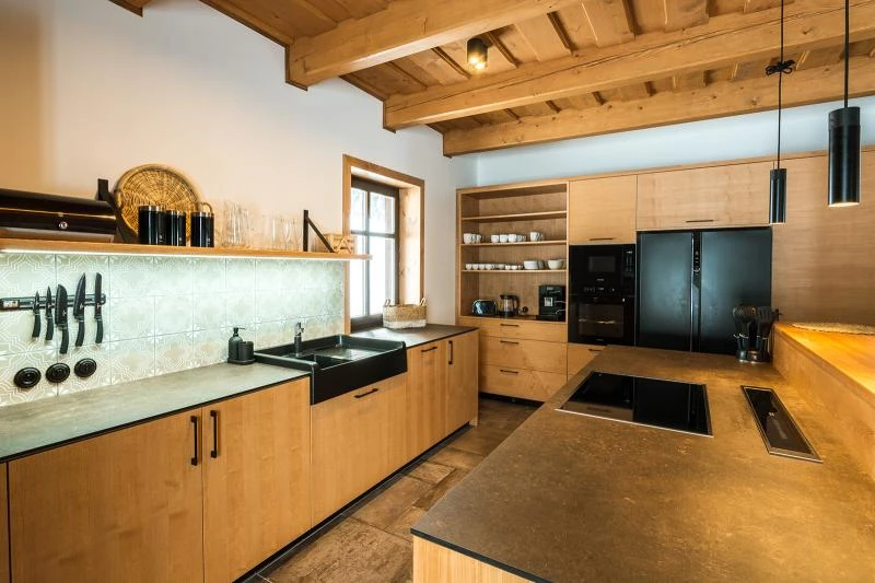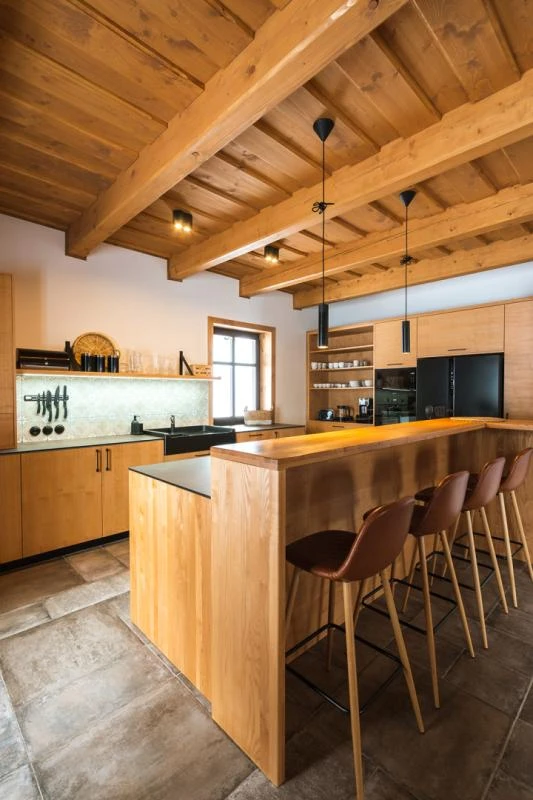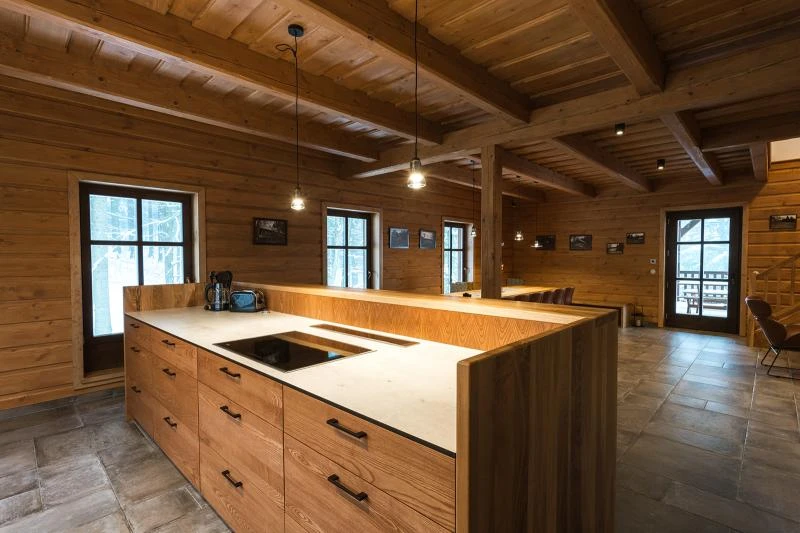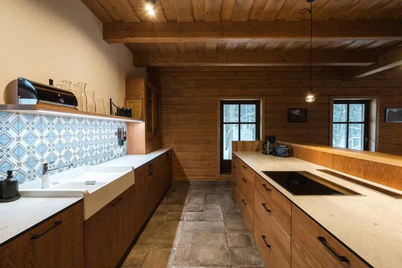Součástí roubenky je plně vybavená kuchyně vhodná pro každodenní provoz i vaření pro více osob. K dispozici je pečicí trouba, indukční varná deska, mikrovlnná trouba, myčka nádobí, americká lednice, kávovar na zrnkovou kávu, varná konvice, tyčový mixér, topinkovač a gril. Jídelní část tvoří velký masivní stůl s dostatečnou kapacitou pro společné stolování.