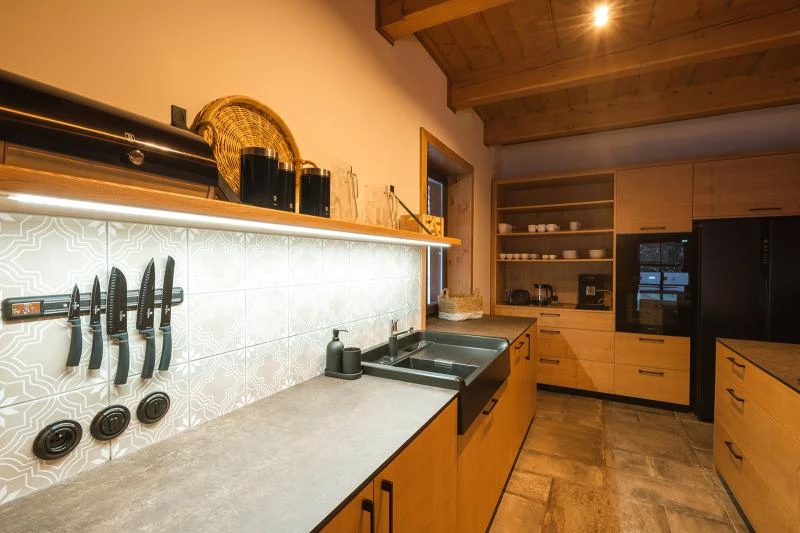 Součástí roubenky je plně vybavená kuchyně, která umožňuje běžné i náročnější vaření. K dispozici je pečicí trouba, indukční varná deska, mikrovlnná trouba, myčka nádobí, americká lednice, kávovar na zrnkovou kávu, varná konvice, tyčový mixér, topinkovač a gril. Jídelní část tvoří velký masivní stůl s dostatečnou kapacitou pro společné stolování.