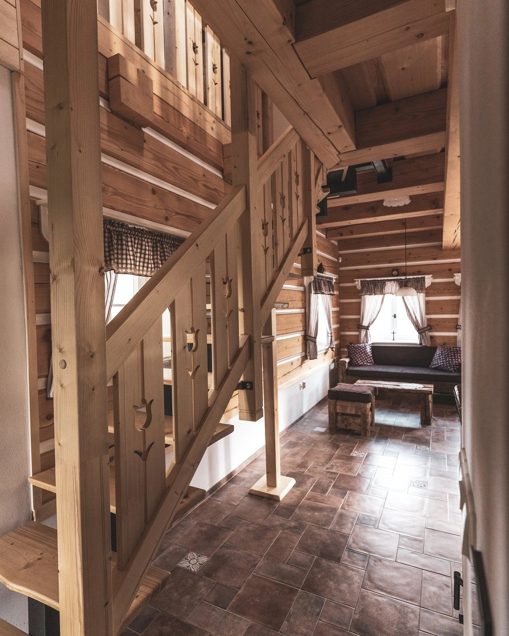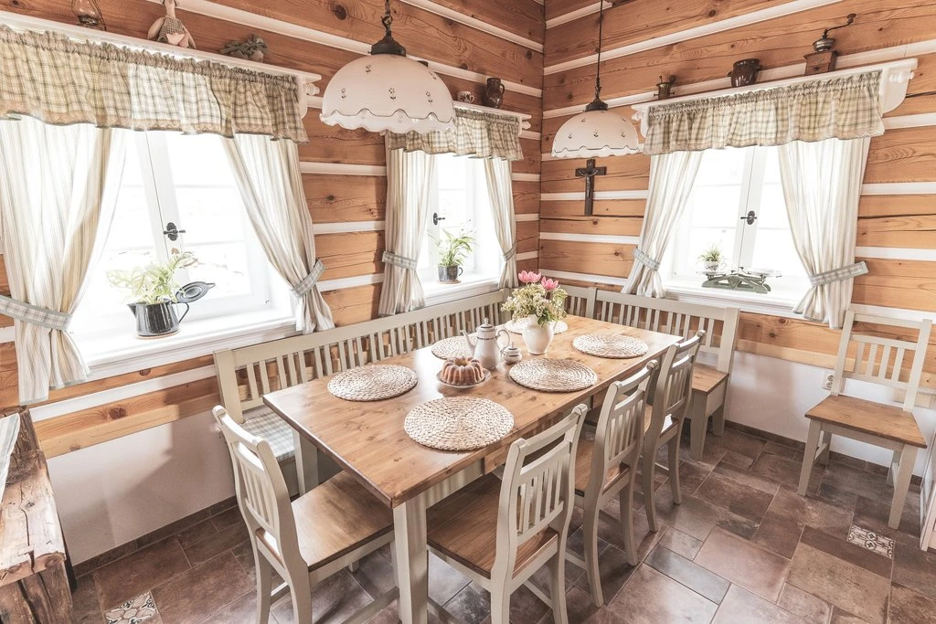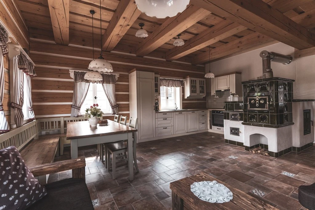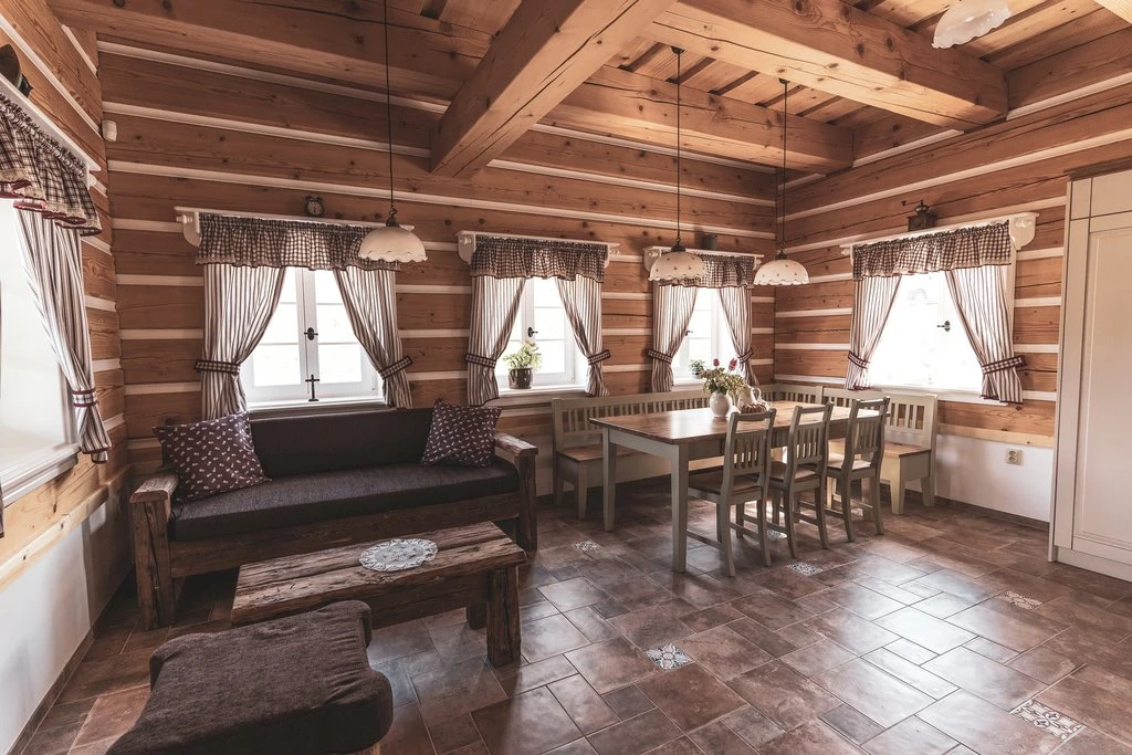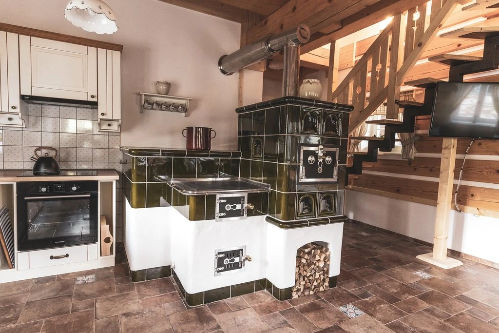 V přízemí každého objektu se nachází prostorný obývací prostor s plně vybaveným kuchyňským koutem, který zahrnuje elektrickou troubu, keramickou varnou desku, mikrovlnnou troubu, kombinovanou lednici, rychlovarnou konvici, topinkovač, kávovar a myčku nádobí. Součástí je jídelní kout s dřevěným posezením. Obývací část je vybavena pohodlnou sedačkou, televizí a kachlovými kamny.