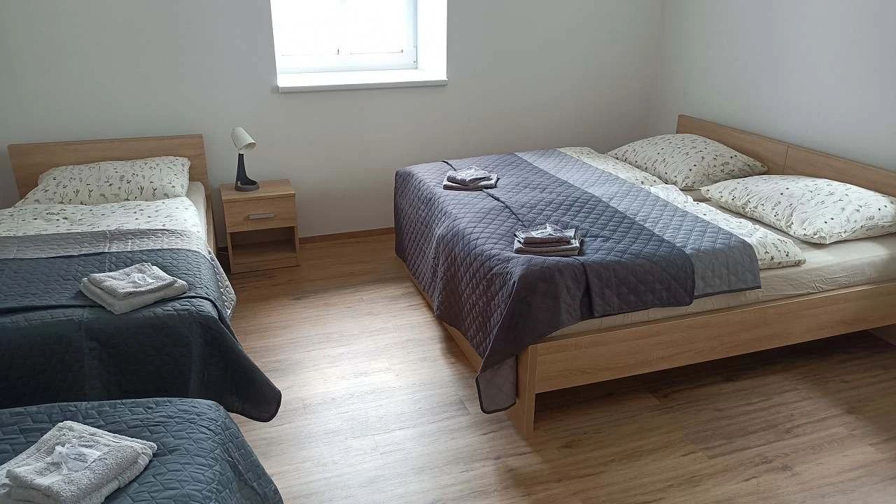 8 lůžek3 ložniceApartmánosmilůžkový apartmán – jedna samostatná ložnice s manželskou postelí, jedna samostatná ložnice s dvěma samostatnými lůžky a jedna samostatná ložnice s čtyřmi lůžky a obývací kuchyň s krbovými kamny. Kuchyň je plně vybavená včetně myčky. V rámci apartmánu je sociální zařízení se sprchovým koutem a toaletou, a další samostatná toaleta.
