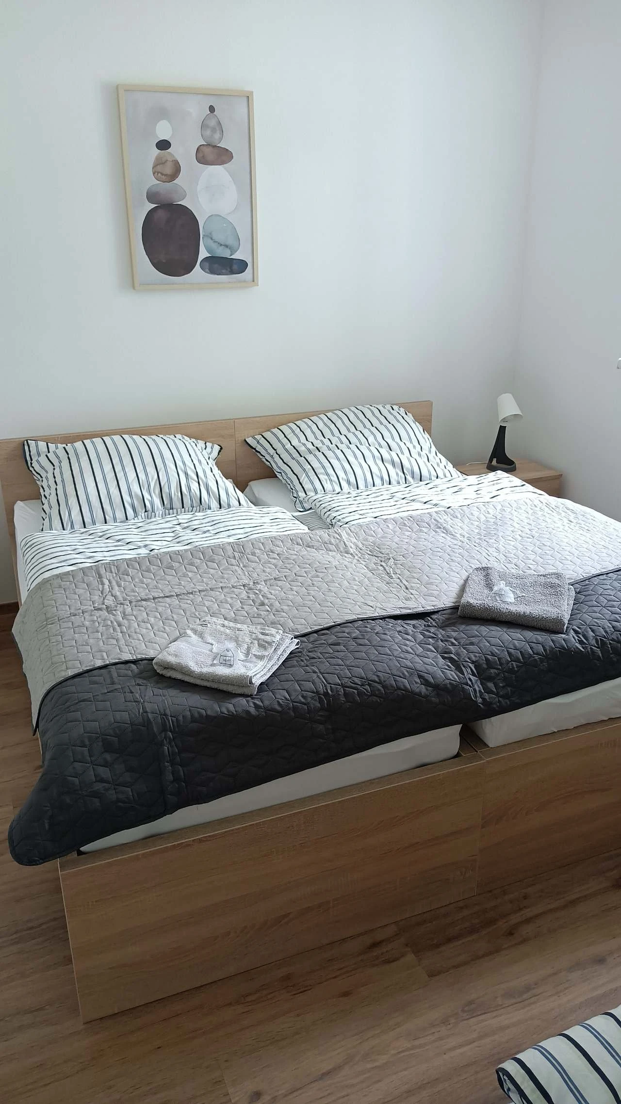 čtyřlůžkový apartmán – ložnice s manželskou postelí a rozkládací pohovkou s dvěma lůžky v obývací kuchyni. V rámci apartmánu je sociální zařízení se sprchovým koutem. Toaleta je součástí koupelny.