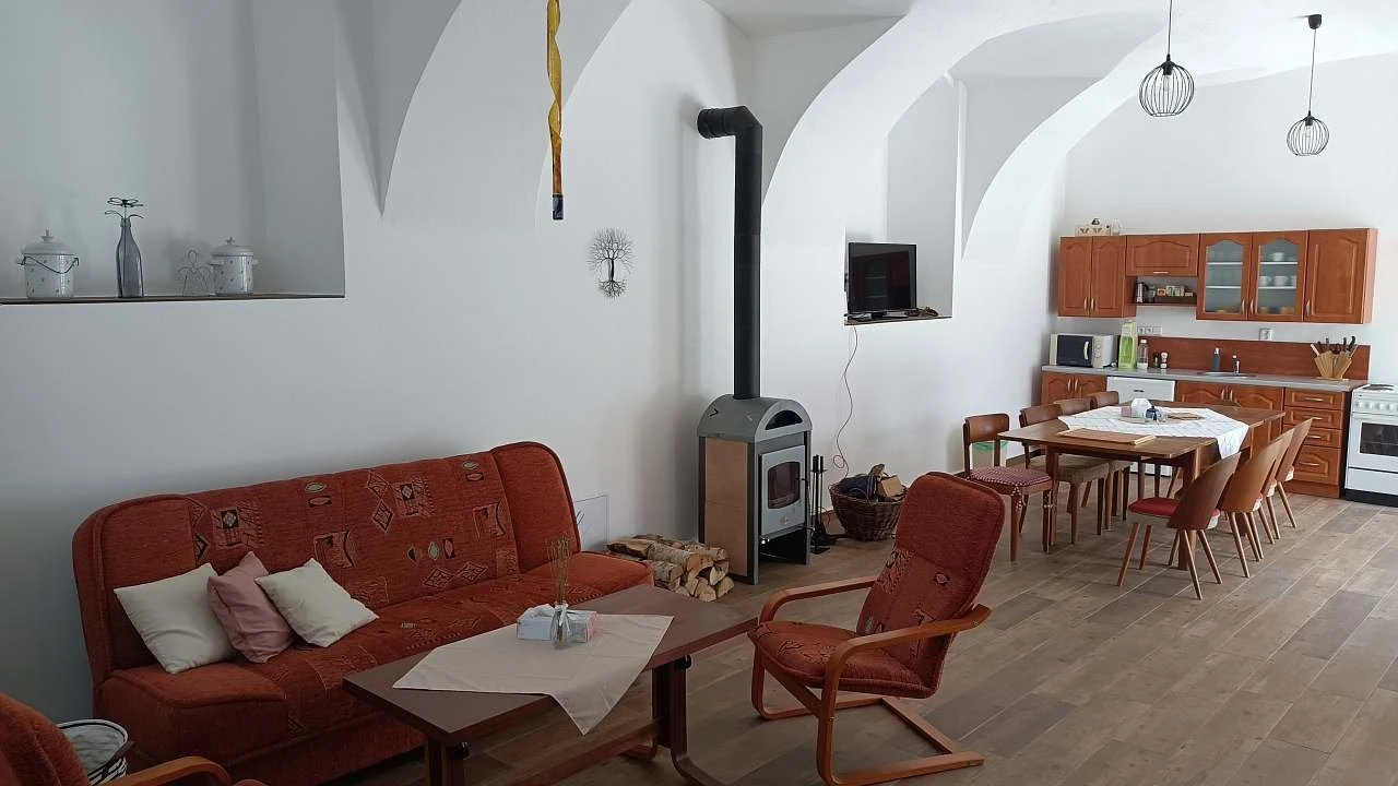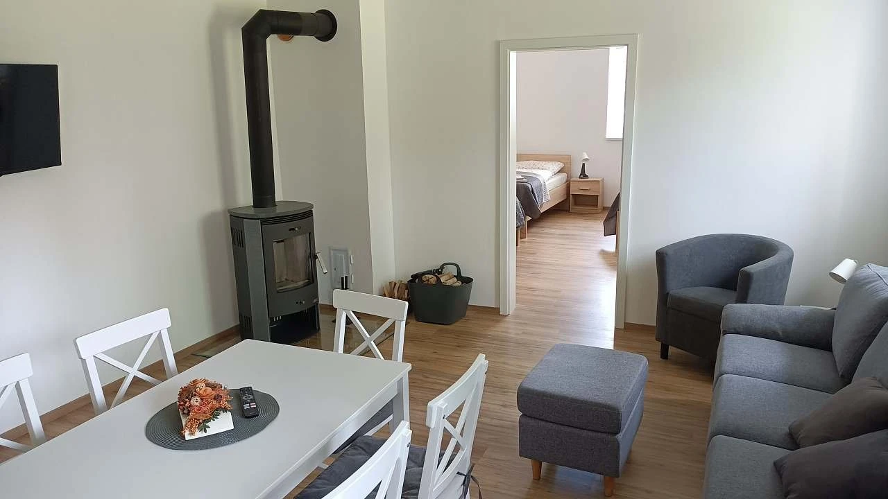 osmilůžkový apartmán – jedna samostatná ložnice s manželskou postelí, jedna samostatná ložnice s dvěma samostatnými lůžky a jedna samostatná ložnice s čtyřmi lůžky a obývací kuchyň s krbovými kamny. Kuchyň je plně vybavená včetně myčky. V rámci apartmánu je sociální zařízení se sprchovým koutem a toaletou, a další samostatná toaleta.