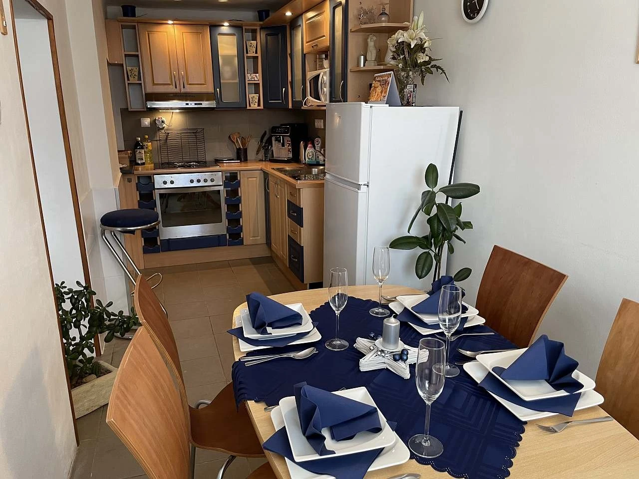 Kuchyně je plně vybavená elektrickým sporákem, lednicí s mrazákem, toustovačem, kávovarem, výrobníkem sody a varnou konvicí. Součástí je jídelní stůl s dětskou židličkou.