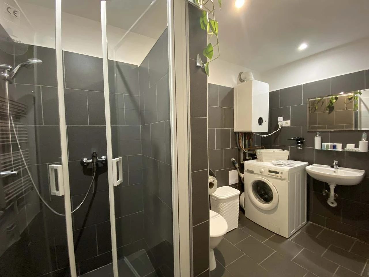 Sociální zařízení zahrnuje koupelnu se sprchovým koutem, WC, umyvadlem a automatickou pračkou.