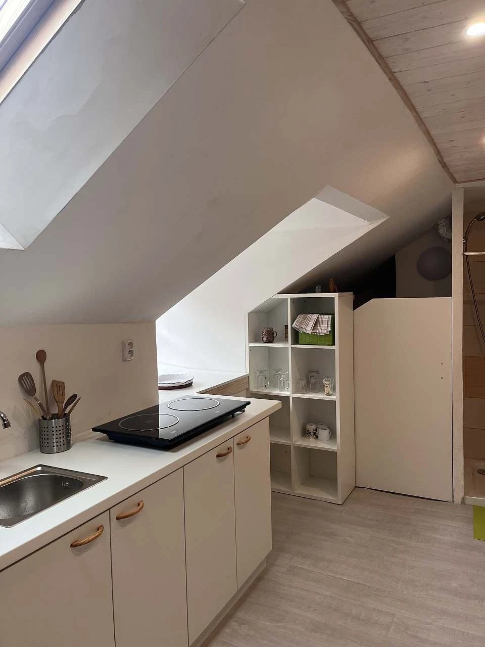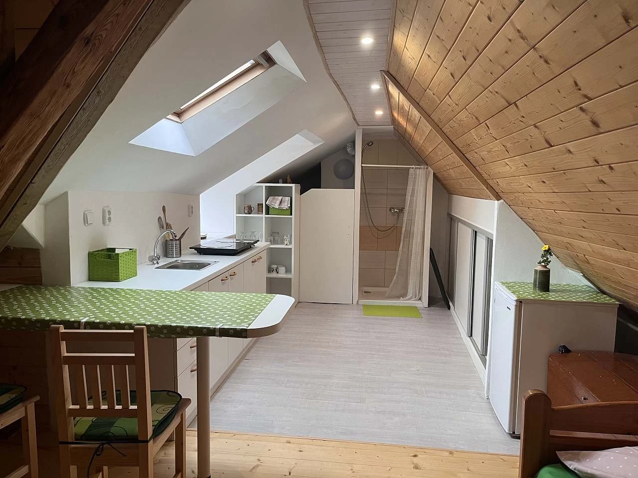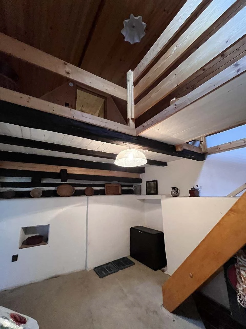 Druhá část apartmánu nabízí dvě lůžka dole a další dvě matrace pod střechou, přístupné po masivních dřevěných schodech (7 příček). Podkroví je přístupné z přízemí a obsahuje krbová kamna, botník a vstupy na vnitřní dvorek a do malé místnosti dříve určené pro odpočinek členů domácnosti.