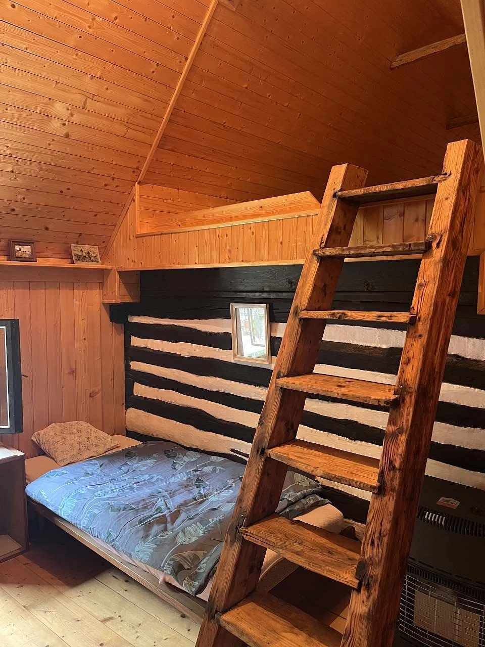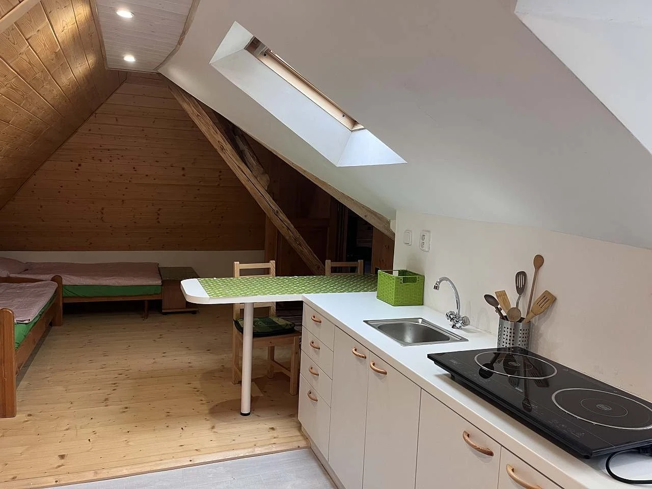 Levá část roubenky nabízí soukromí pro 2–7 hostů. Podkrovní místnost ve tvaru L obsahuje vybavený kuchyňský kout s jídelním stolem, sociální zařízení se sprchovým koutem a indukční plotýnku. Obývací prostor slouží jako společná ložnice se dvěma lůžky.
