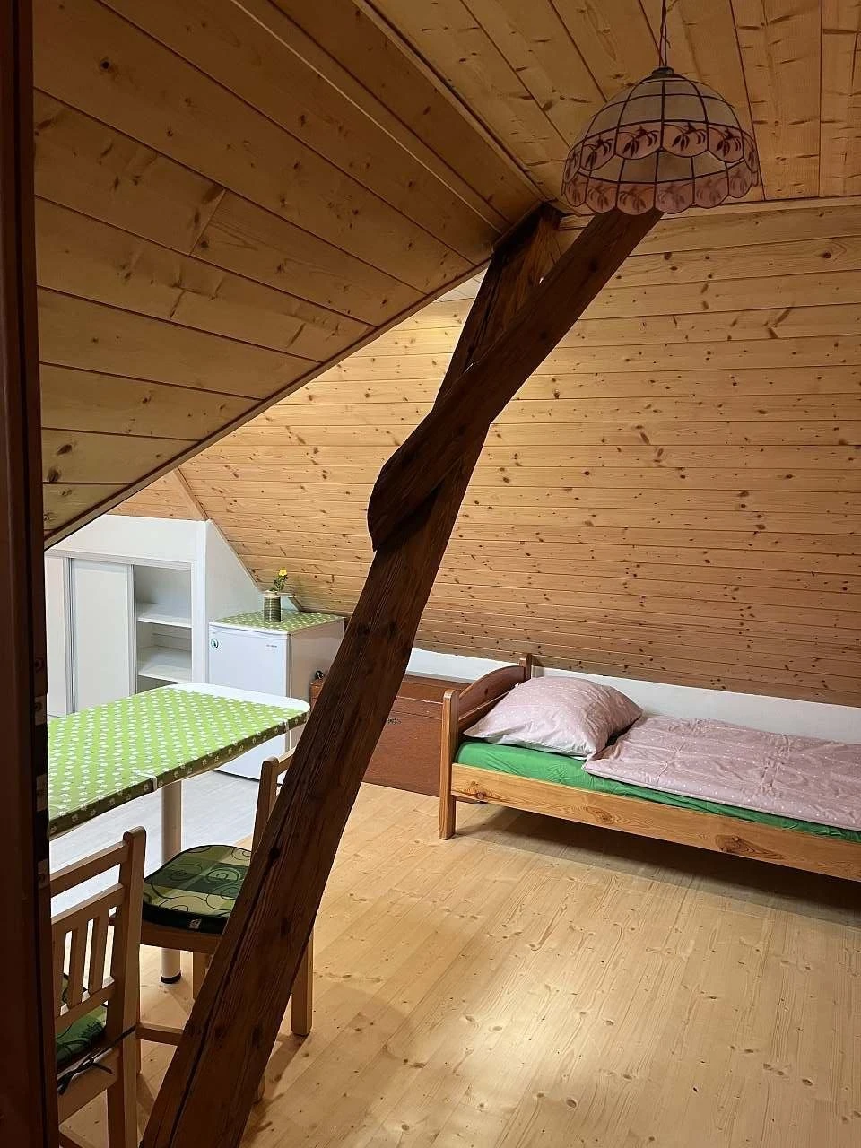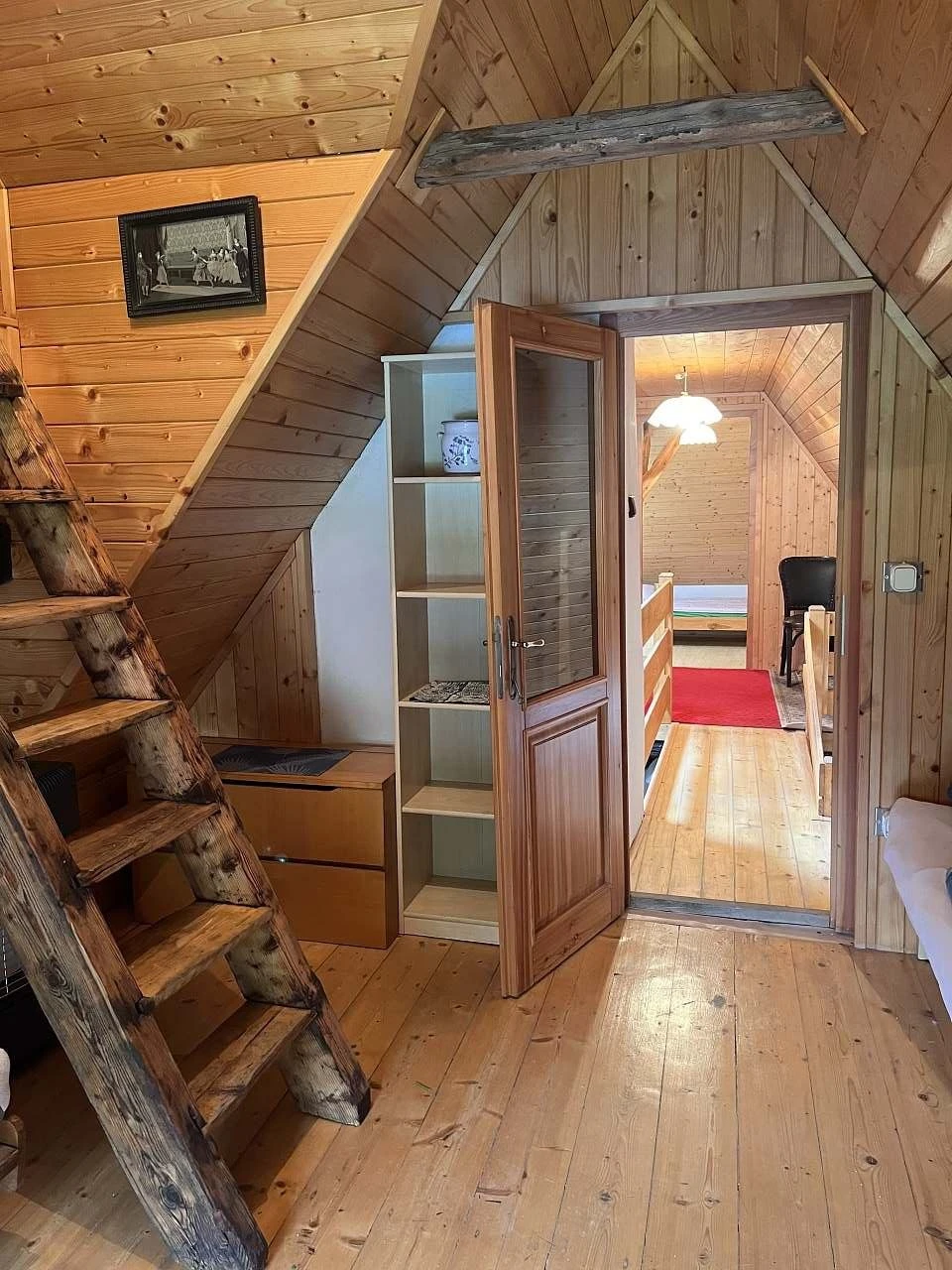 - Nahoře (podkroví): ložnice s 3 lůžky, hostinský pokoj s 2 lůžky
