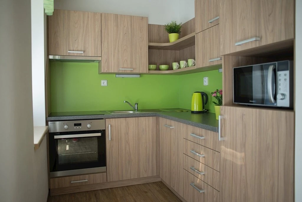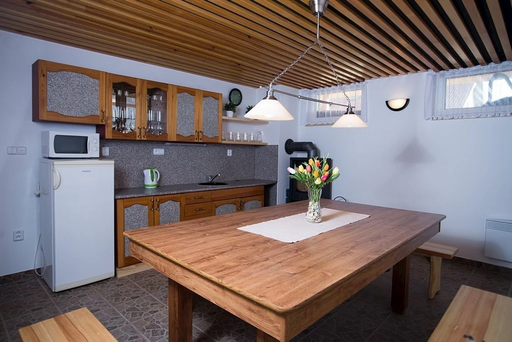- Kuchyň: elektrická trouba, keramická varná deska, mikrovlnná trouba, rychlovarná konvice, lednička s mrazničkou, myčka nádobí