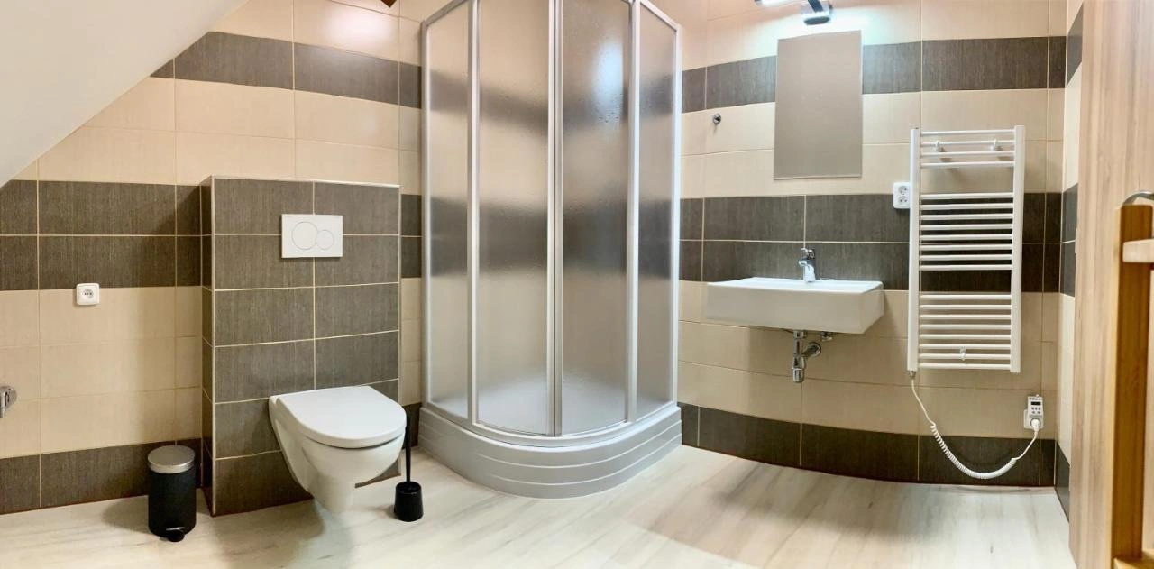 - Koupelna a toaleta: 1 koupelna se sprchovým koutem, 1 samostatná toaleta, fén, ručníky