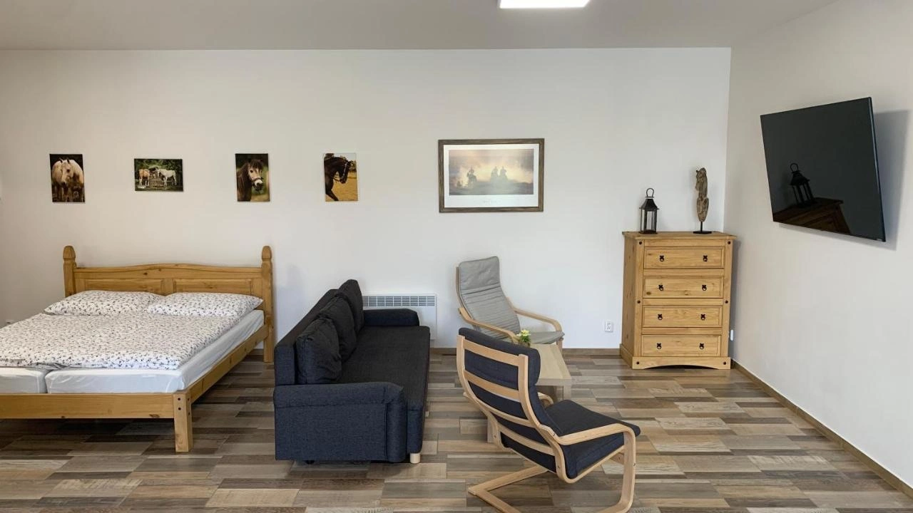 - Studio č. 3 – 1 ložnice s manželskou postelí a jednolůžkem, obývací prostor s rozkládacím gaučem.