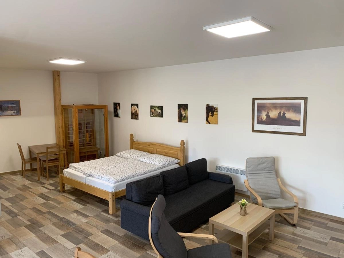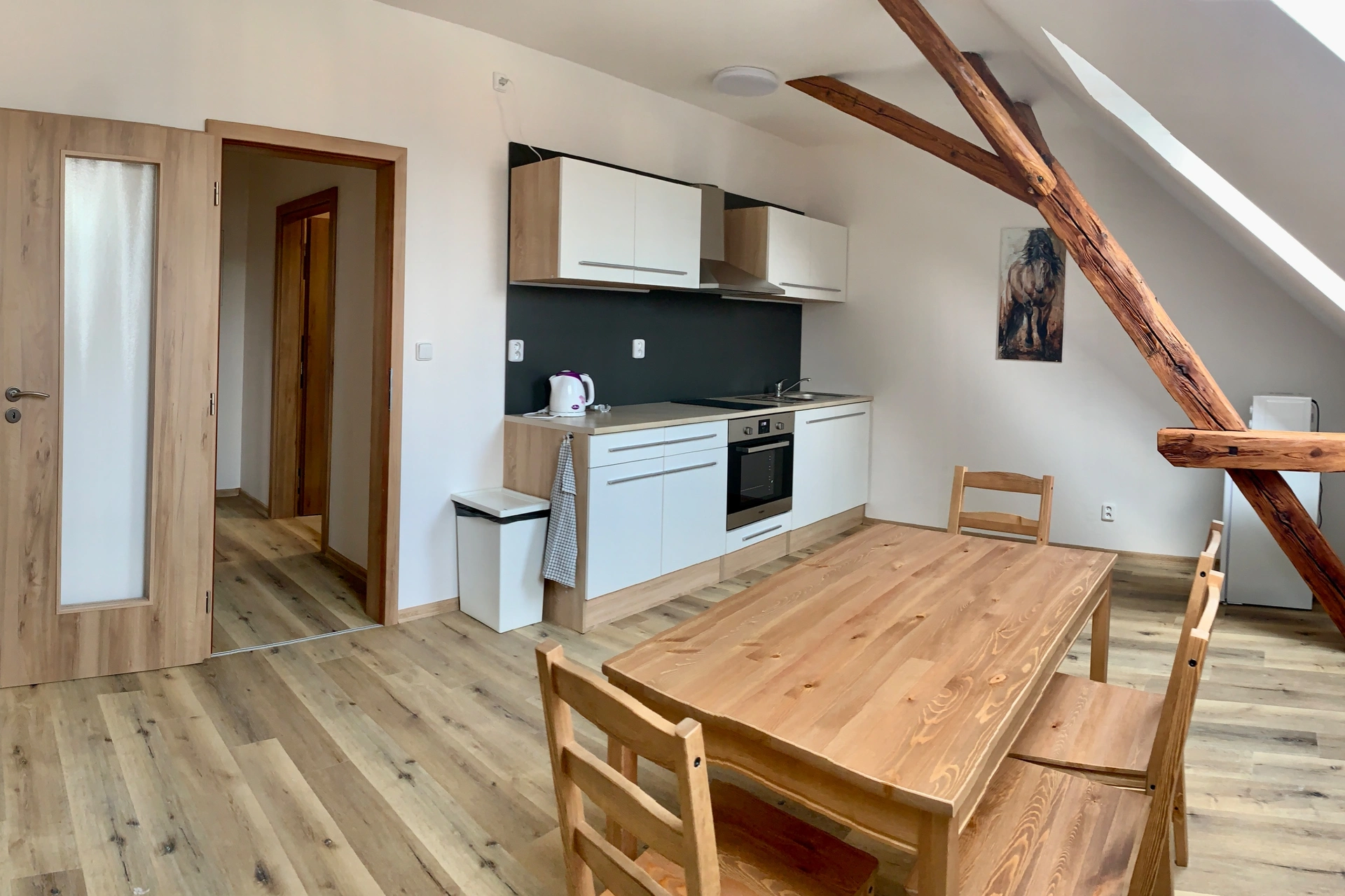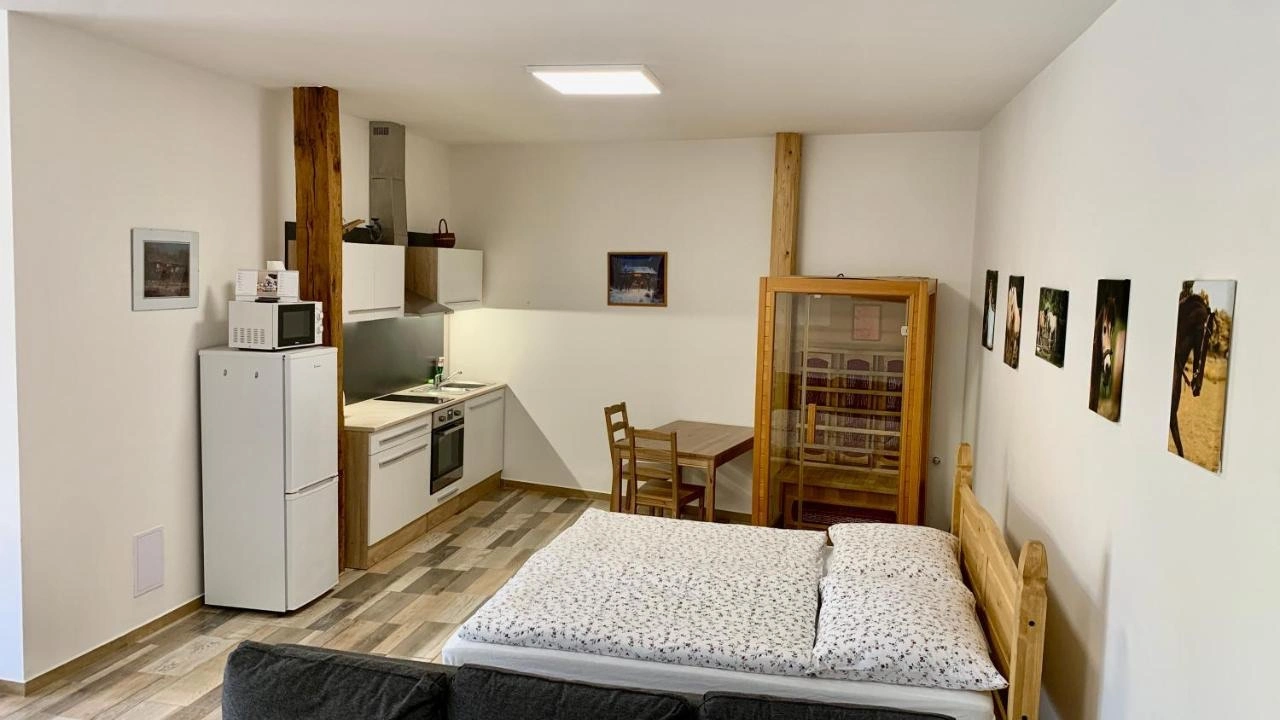 - Apartmán č. 2 – 1 ložnice s manželskou postelí a jednolůžkem; v obývacím prostoru další samostatné lůžko a rozkládací pohovka.