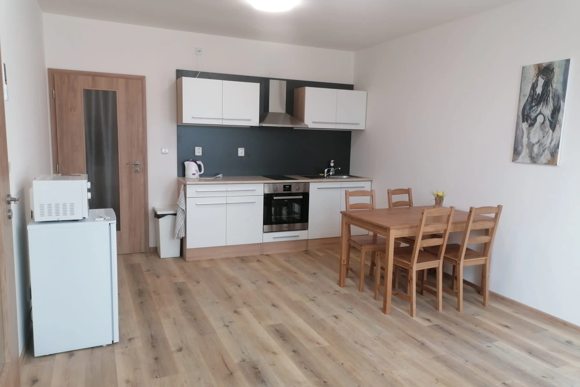 Každý apartmán disponuje kuchyňským koutem, koupelnou, toaletou, ložnicí a obývacím prostorem.