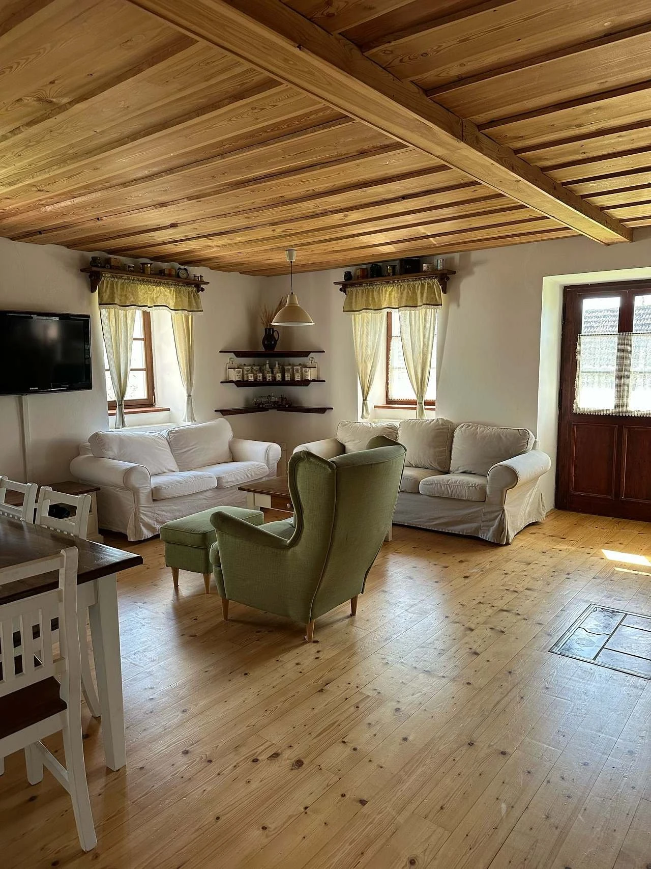 V spodní části statku se nachází vstupní chodba, obývací pokoj s kuchyní, koupelna s vanou, WC a jeden pokoj s manželskou postelí a palandou. V podkroví je chodba a tři pokoje, každý s manželskou postelí, dále zde je koupelna se sprchovým koutem a WC. Jedna z koupelen je vybavena pračkou a sušičkou.
