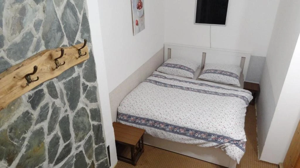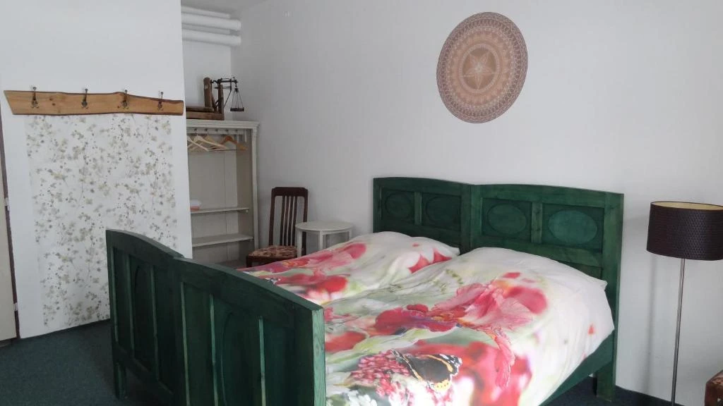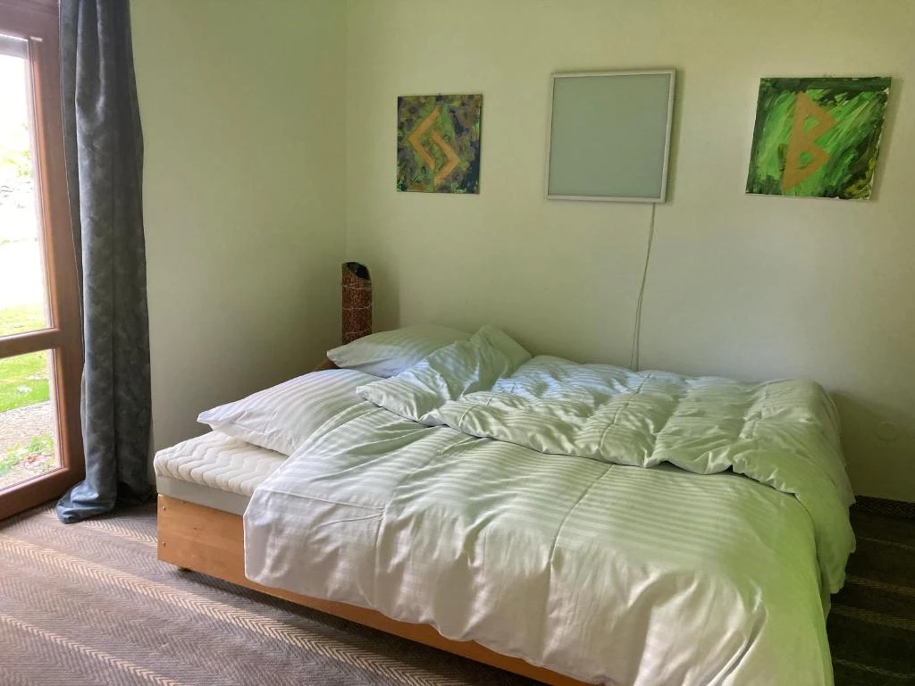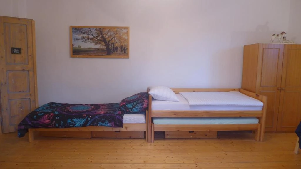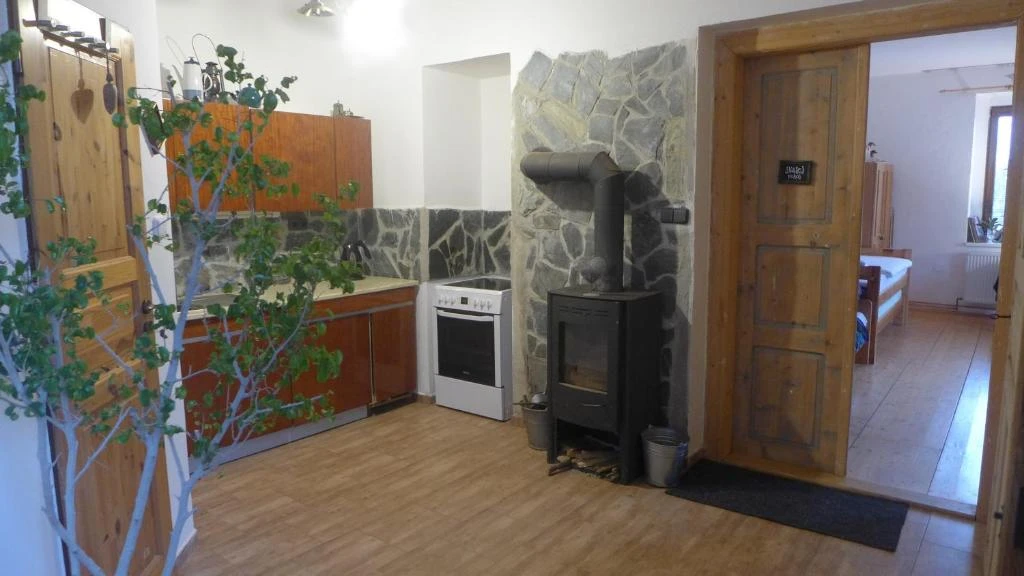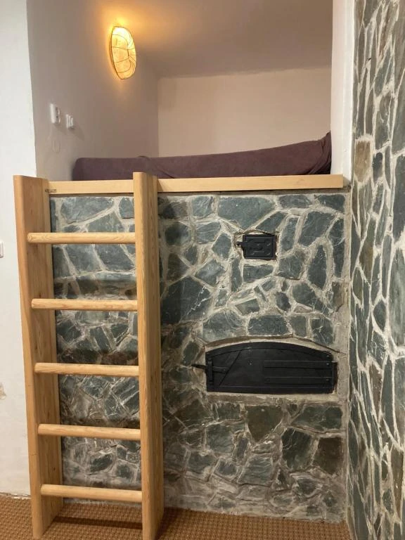 Pokoj Pec: Ubytování pro 4 osoby s dvojlůžkem na peci a jedním dalším dvojlůžkem, včetně vlastního sociálního zařízení.