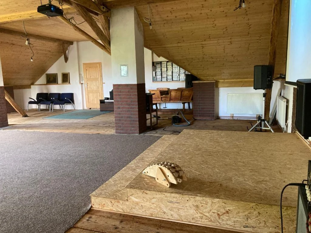 - Půda: Prostor o rozměrech 11x13 metrů vhodný pro cvičení, workshopy a dětské aktivity.