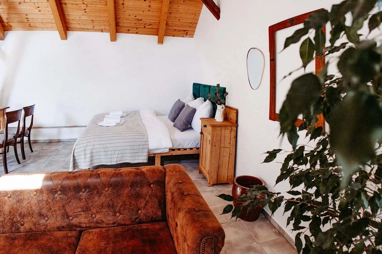 Apartmán č. 3 má kapacitu 2 lůžka, nachází se v 1. patře a jeho celková plocha je 31 m². Apartmán disponuje jednou ložnicí, relaxační zónou a koupelnou se sprchovým koutem a WC, která je umístěna přes chodbu.Součástí ubytování je sdílená kuchyně o velikosti 16 m², přičemž každý apartmán má vlastní nádobí a k dispozici jsou myčka nádobí, elektrická varná deska, trouba a lednice s mrazákem. Apartmán je vybaven klimatizací s funkcí topení (tepelné čerpadlo), elektrickým podlahovým topením, Wi-Fi připojením a TV.V ceně pobytu je zahrnut neomezený přístup do společenské stodoly, bazén se slanou vodou, sauny s koupacím sudem, posezení na zahradě s pergolami a plynový gril. Hosté mohou dále využívat uzavřenou zahradu s ovocným sadem o rozloze cca 2 800 m², vhodnou k odpočinku a relaxaci.