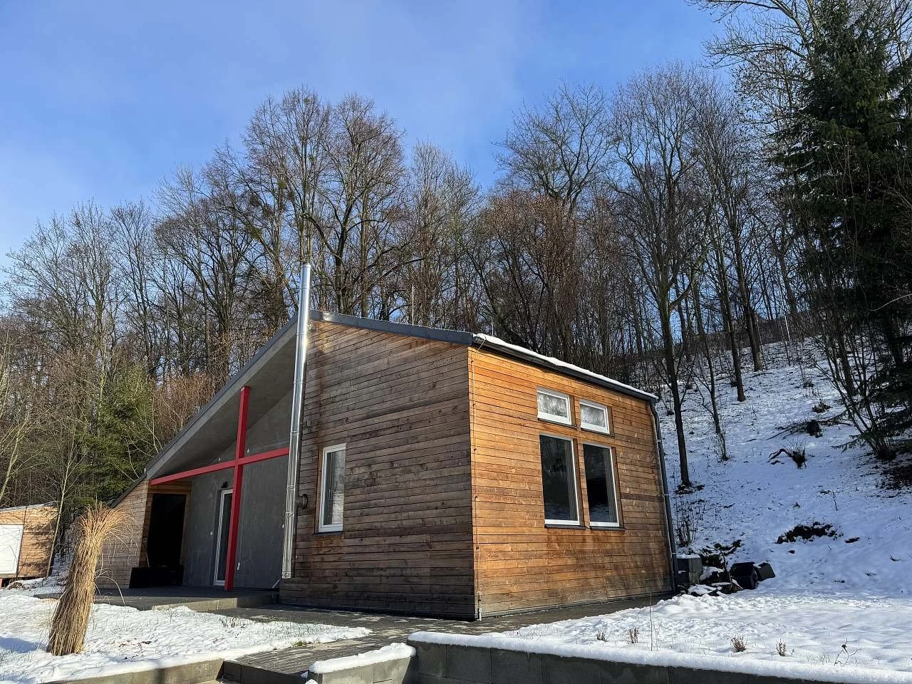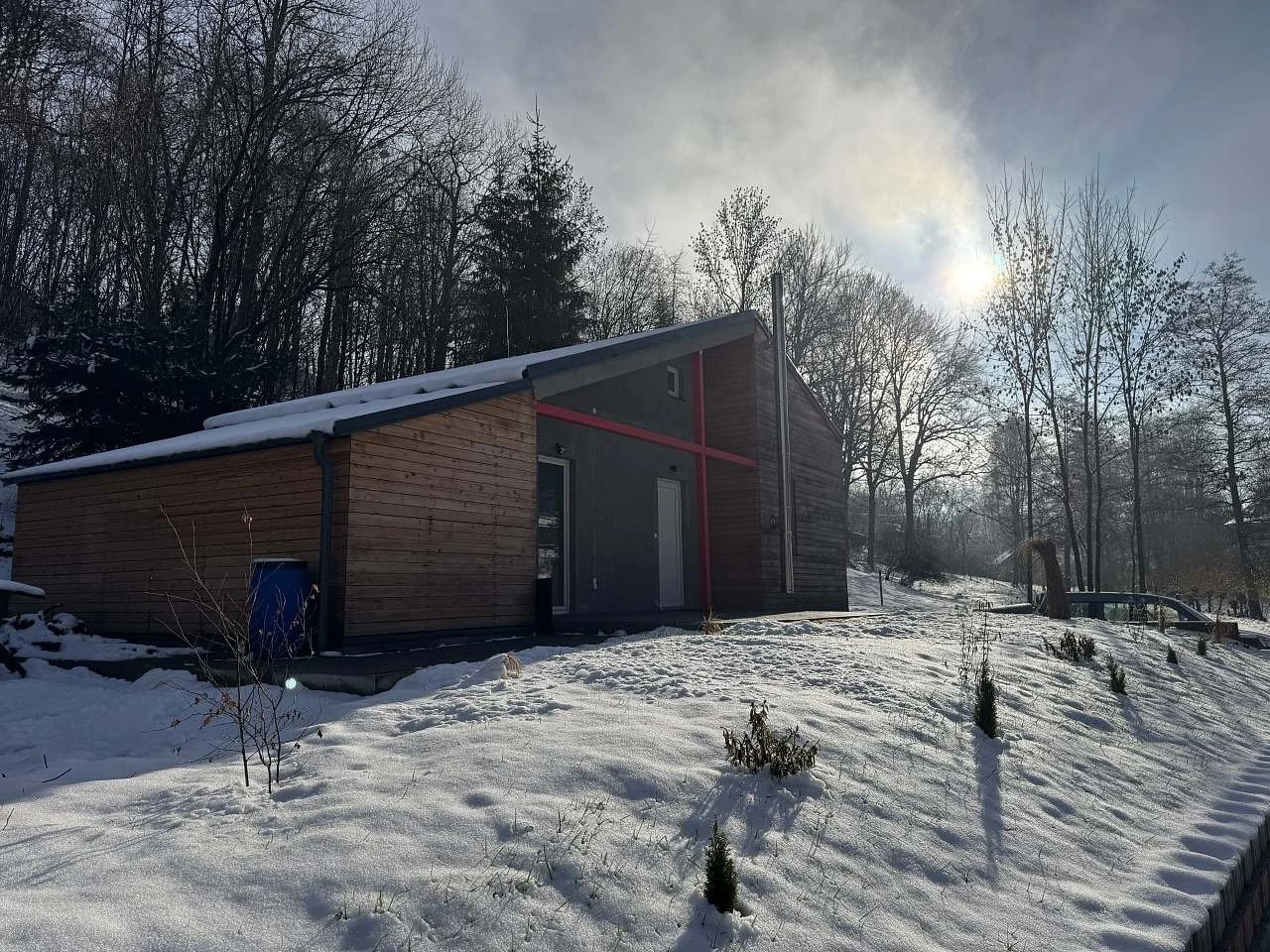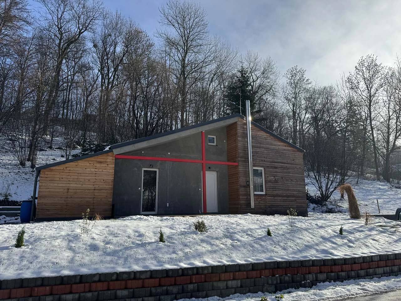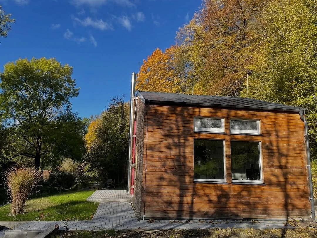 Exteriér chalupy bude postupně dokončen a nabídne venkovní saunu, koupací sud, terasu, zahradní posezení a ohniště.