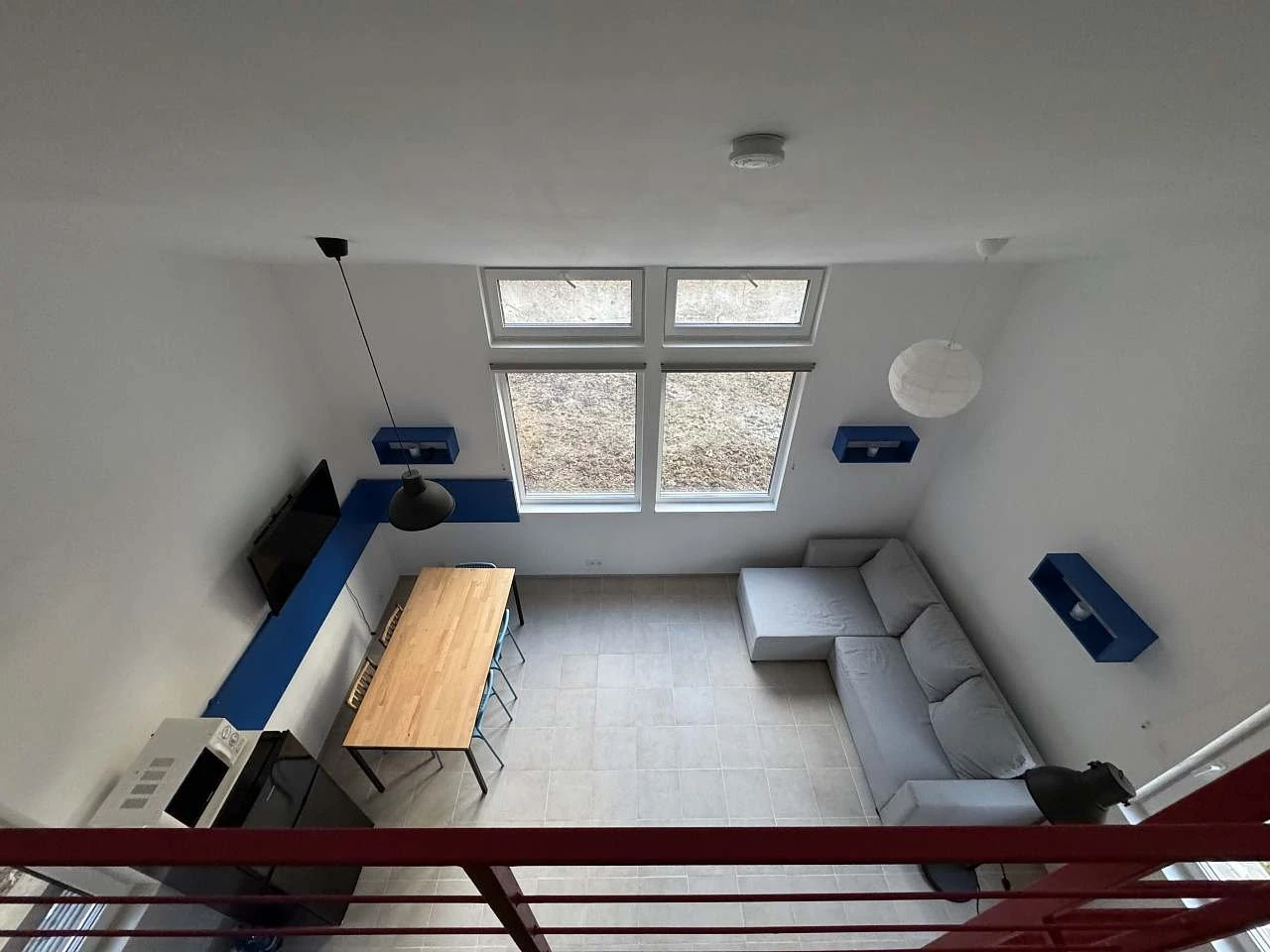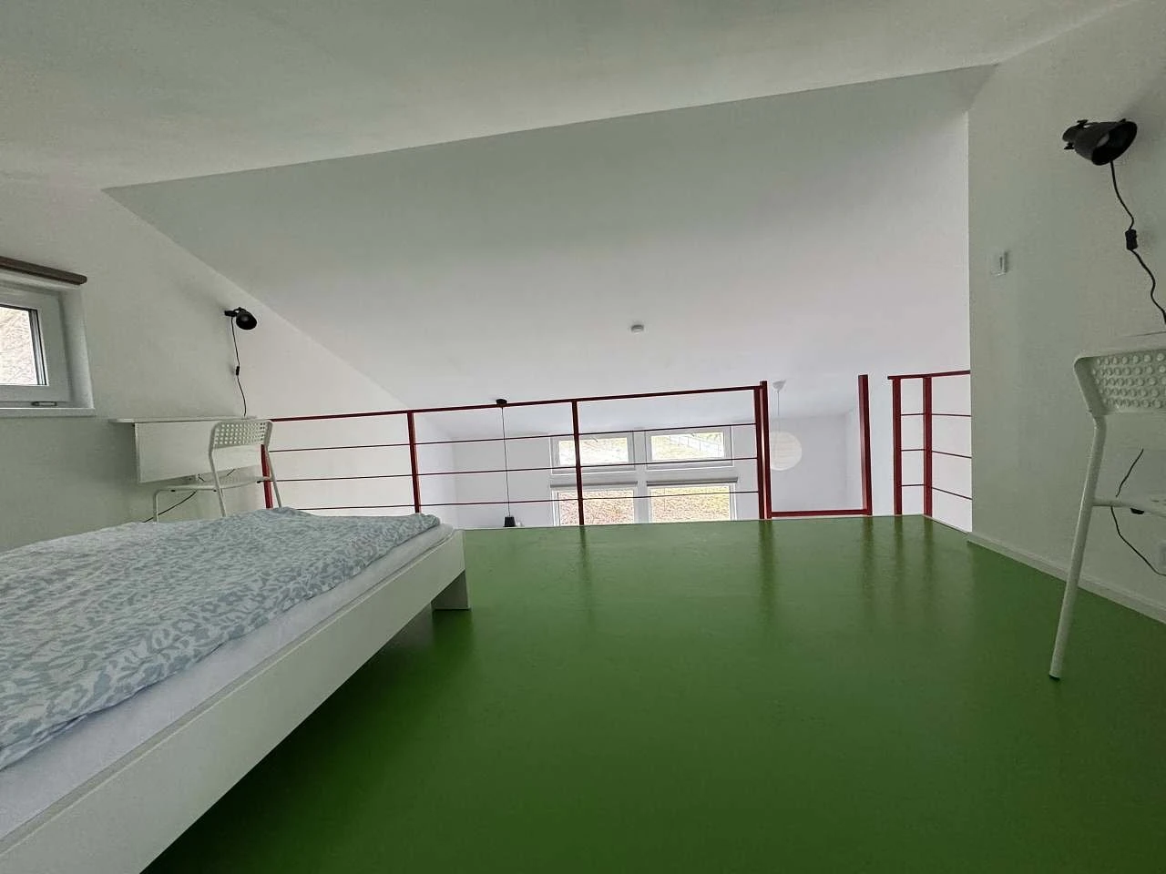 - Ostatní prostory: obytná místnost s kuchyní a jídelním stolem, malá odpočinková zóna v podkroví, dva sklopné pracovní stolky