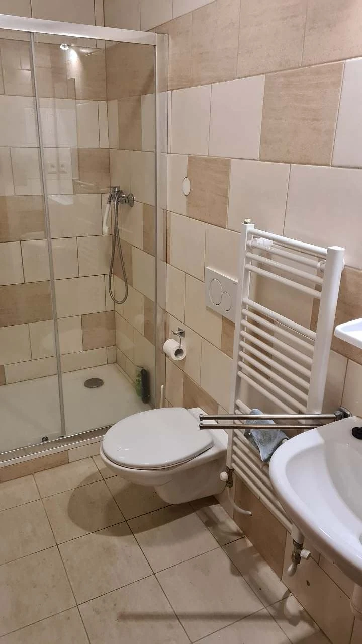 K dispozici jsou dvě sociální zařízení. V přízemí je sprchový kout a WC, v prvním patře koupelna s rohovou vanou a WC. Vytápění je řešeno pomocí elektrického kotle s ústředním topením.