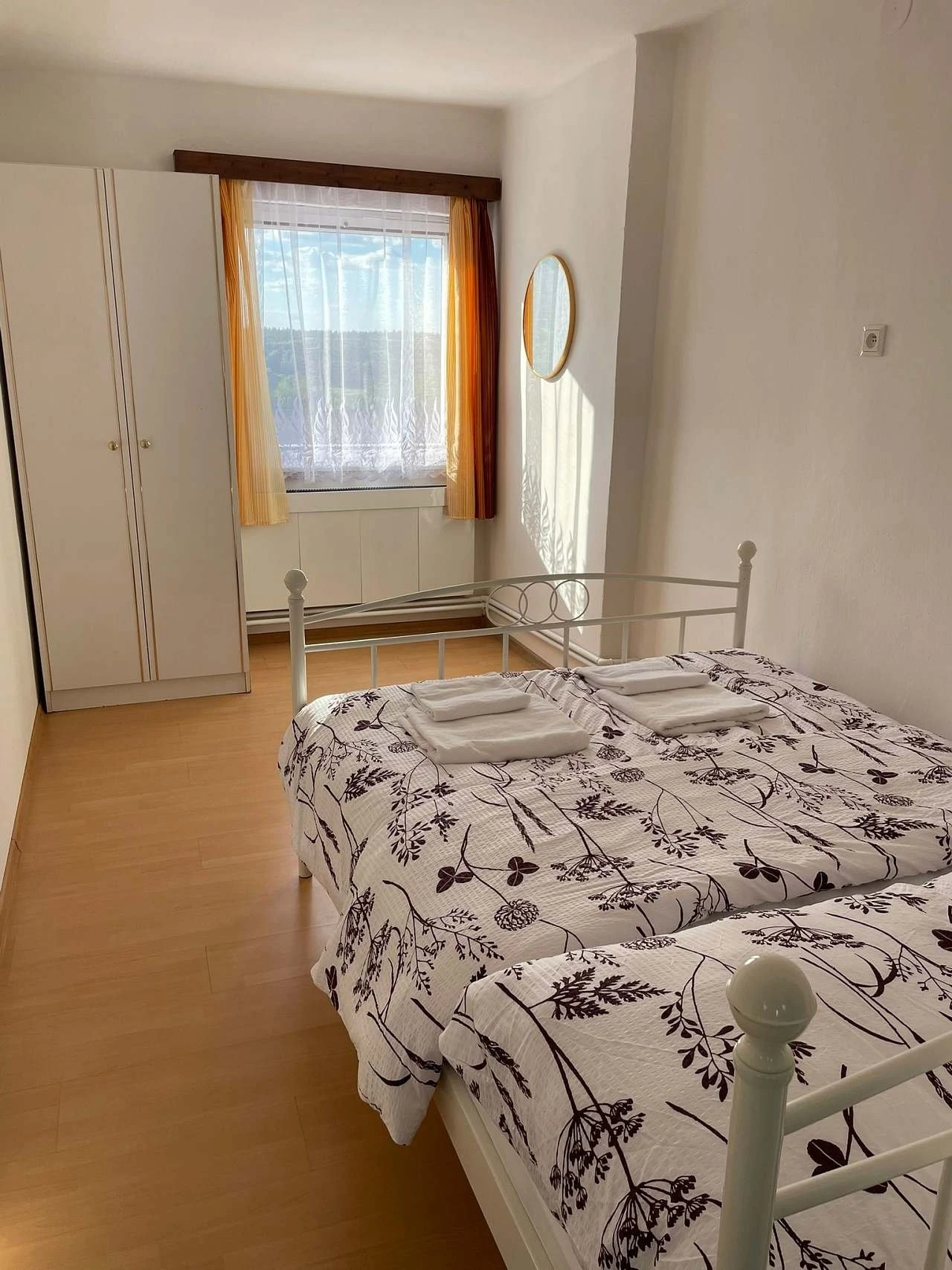 - Ubytování nabízí tři ložnice pro celkem 6 osob. K dispozici jsou dvě dvoulůžkové ložnice (postele 140 cm a 180 cm) a jedna ložnice se dvěma jednolůžky. Součástí apartmánu je vybavená kuchyňka s jídelním koutem, obývací pokoj, koupelna, WC a balkon.