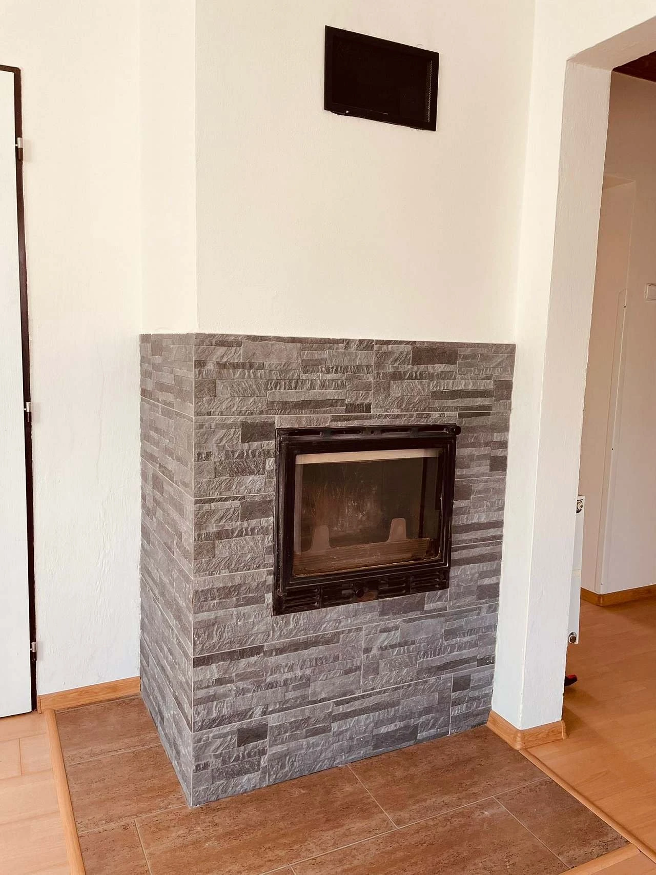 Vytápění zajišťuje krb v obývacím pokoji, v koupelně je elektrické topení.