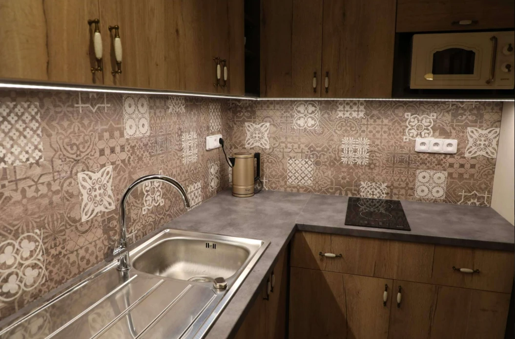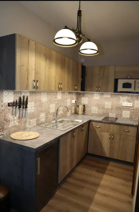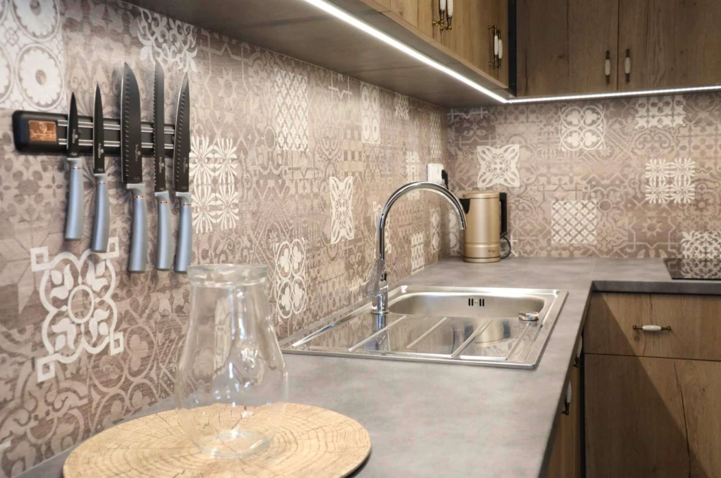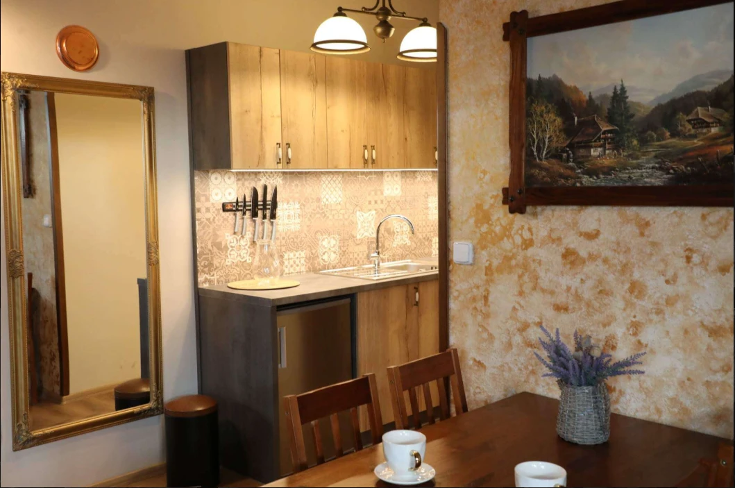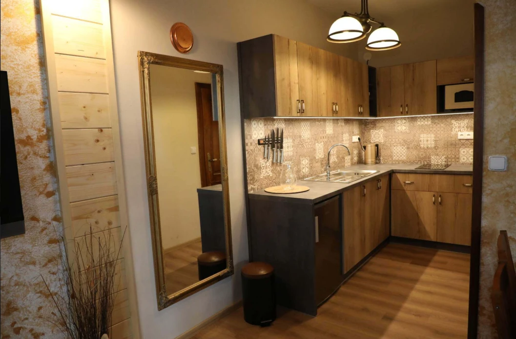 - Kuchyň: keramická varná deska, lednice s mrazákem, mikrovlnná trouba, kávovar, topinkovač