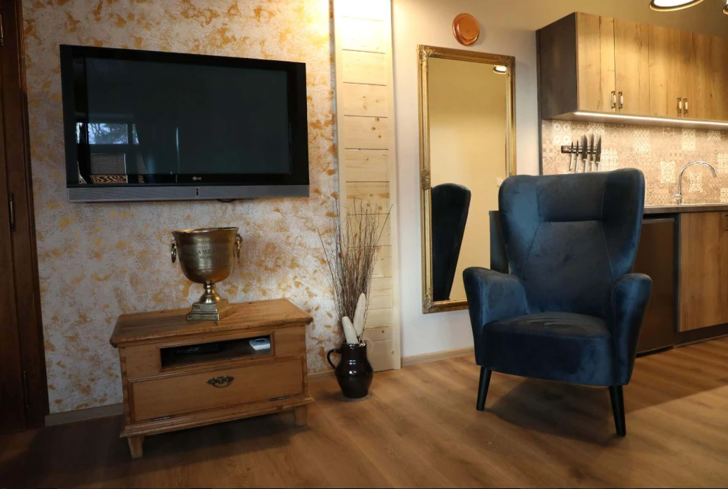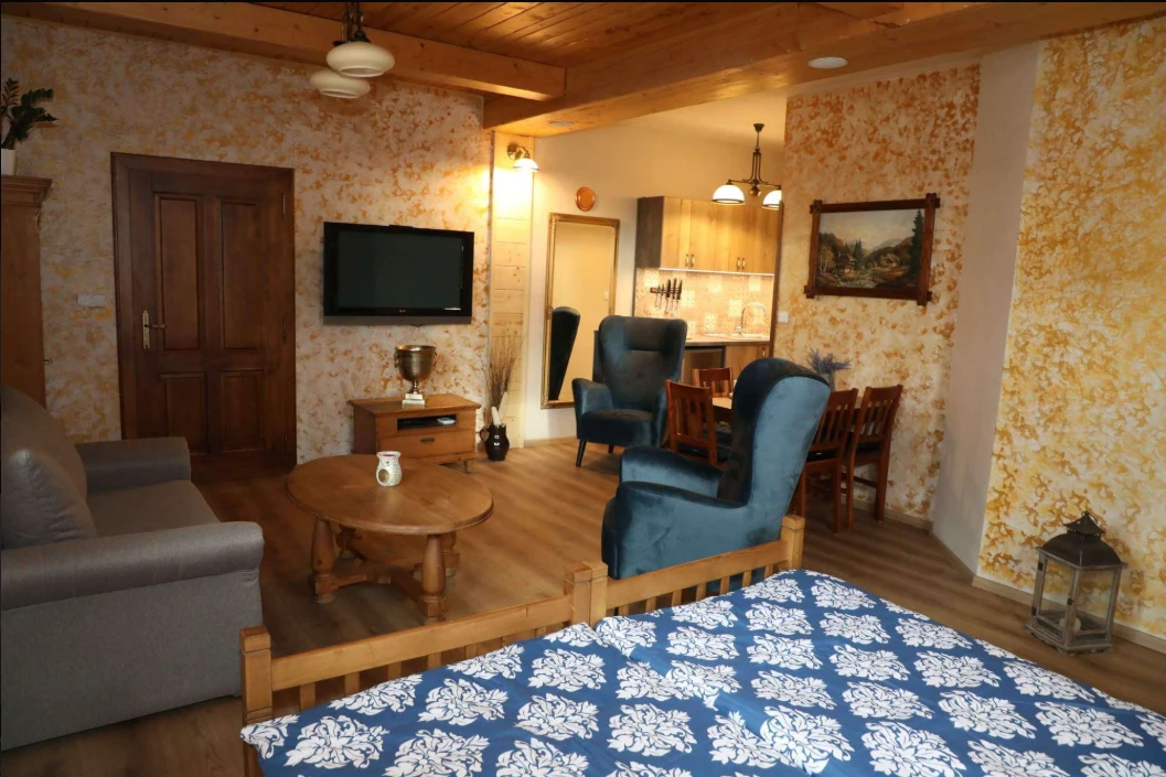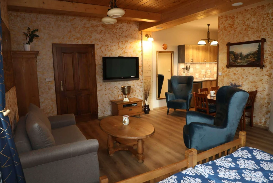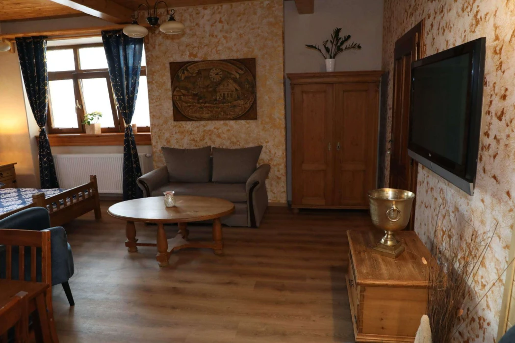- Obývací místnost: manželská postel, jídelní posezení, TV se satelitním příjmem, pohovka (přistýlka)
