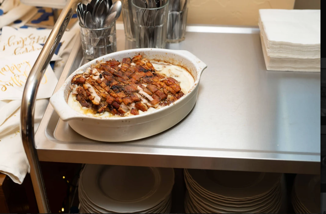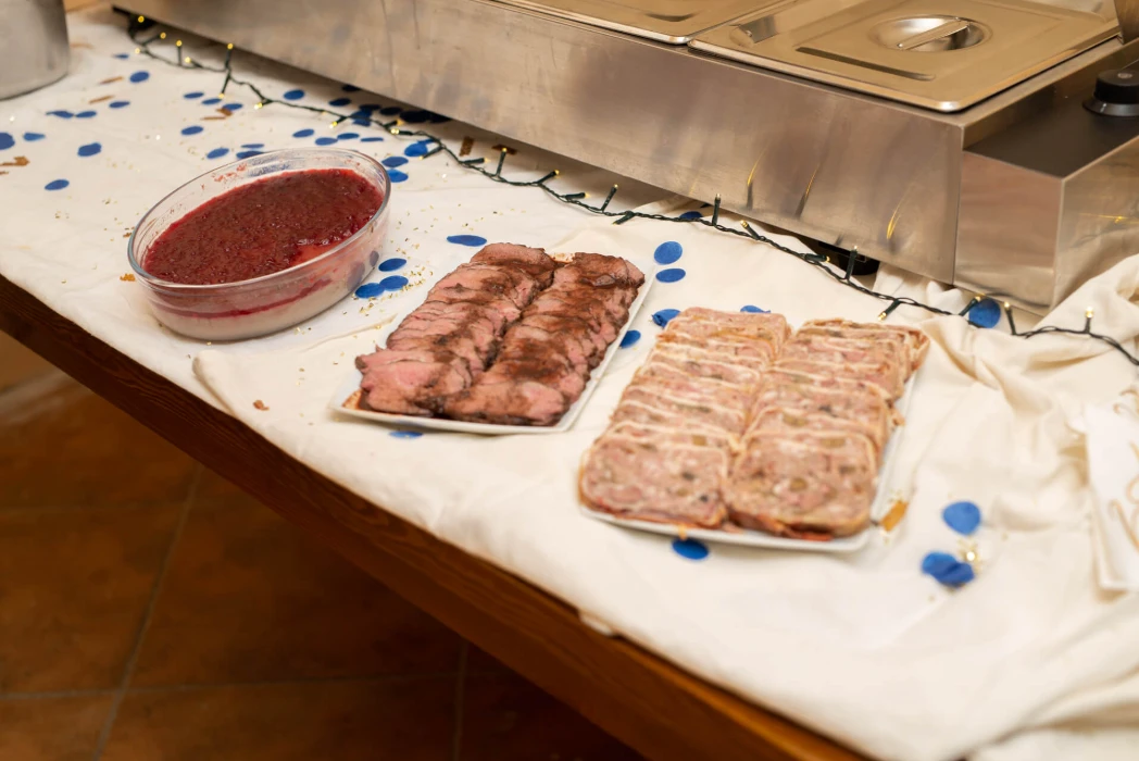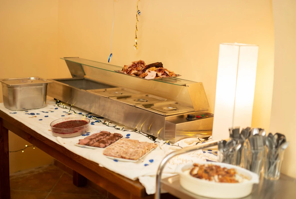 Pro catering je zajištěno potřebné gastro zázemí, včetně skla, nádobí, příborů, ohřevné vany, gastronádob a elektrických kotlíků. Kuchyň je plně vybavena dvěma elektrickými varnými deskami, dvěma elektrickými troubami, digestoří, dvěma myčkami nádobí, dvěma velkými lednicemi, nerezovými dřezy a regály.