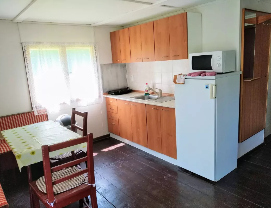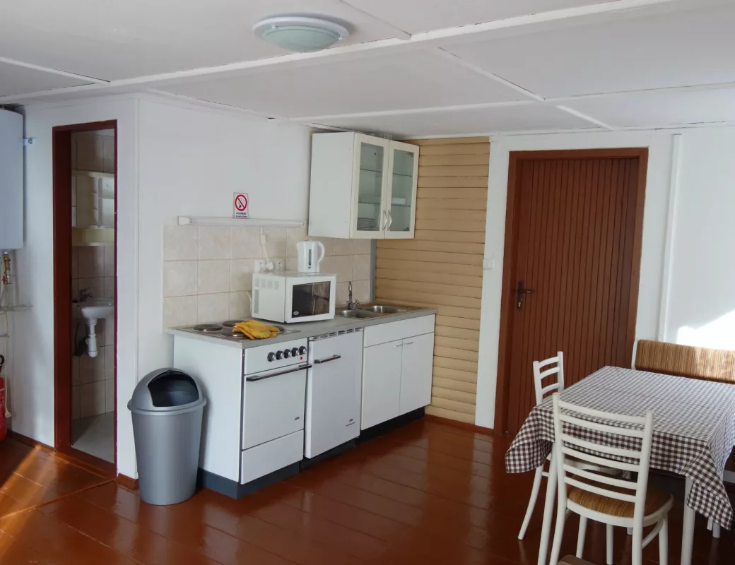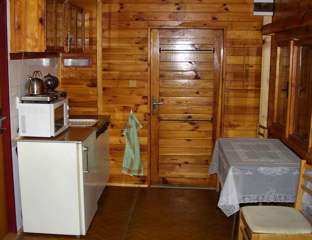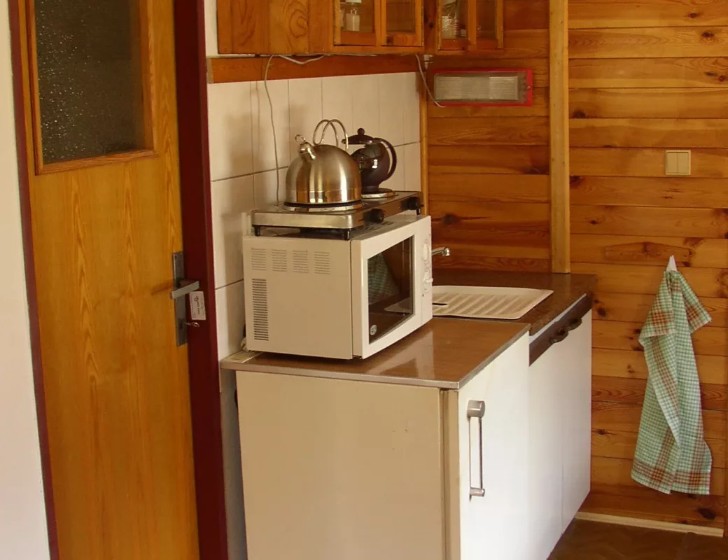 Chatka má kompletně vybavený kuchyňský kout (nádobí, lednička, mikrovlnná trouba, rychlovarná konvice, plotýnkový vařič).