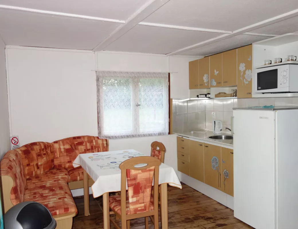 Pro páry nebo rodinu s menšími dětmi máme připravenou malou chatku.Je vhodná pro 2–3 dospělé osoby (spaní max. 3 dospělí, nebo 2 dospělí a 2 děti).Chatka má kompletně vybavený kuchyňský kout (nádobí, lednička, mikrovlnná trouba, rychlovarná konvice, plotýnkový vařič).Spaní je možné na 2 válendách a rozkládacím gauči. Součástí je koupelna (umyvadlo, WC, vana) s teplou vodou po celý den, krytá terasa s posezením a ohništěm. Pro všechny chaty je společné dětské hřiště se skluzavkou, houpačkami a trampolínou.Malá chatka je vhodná volba pro páry nebo rodinu s 1–2 malými dětmi.