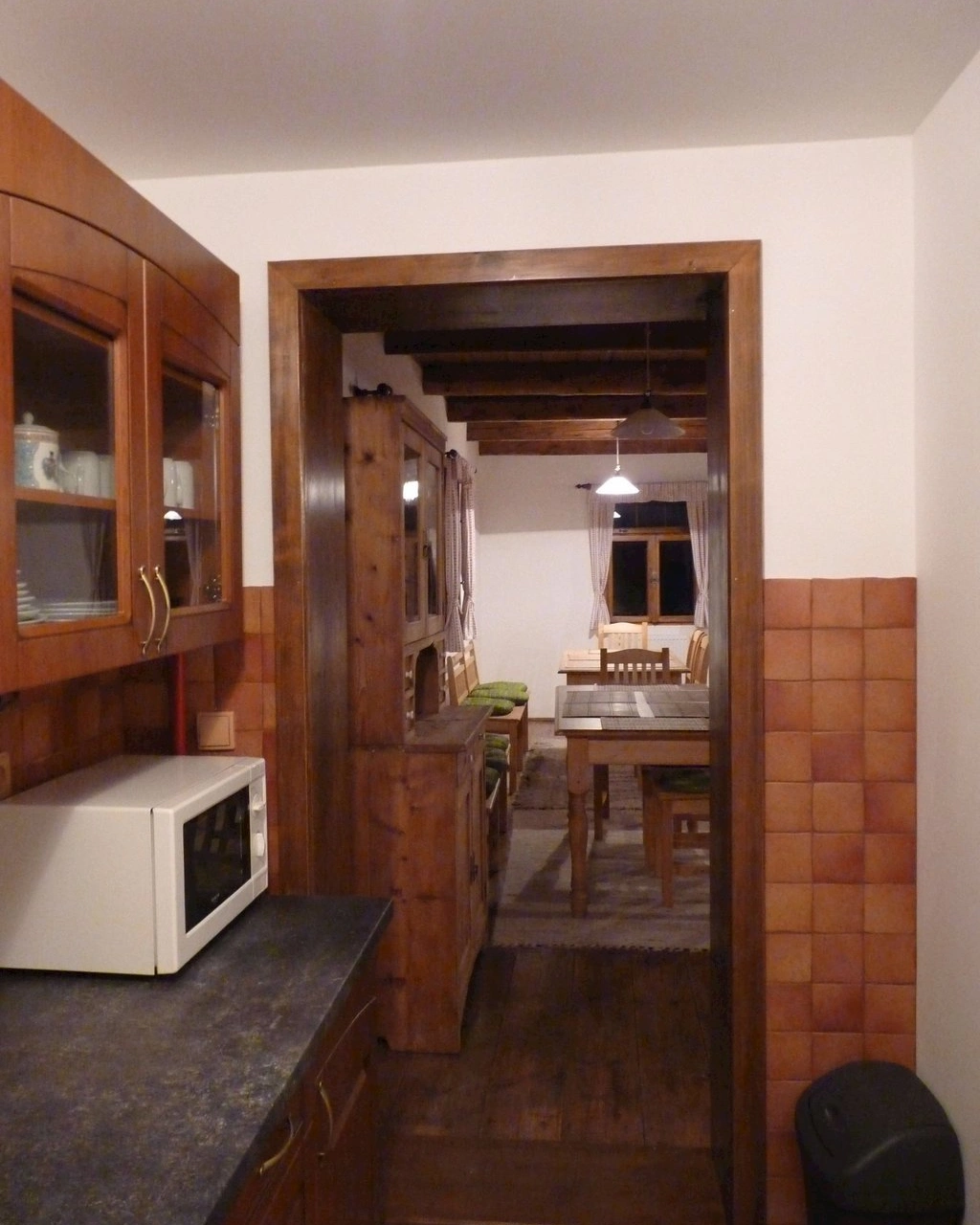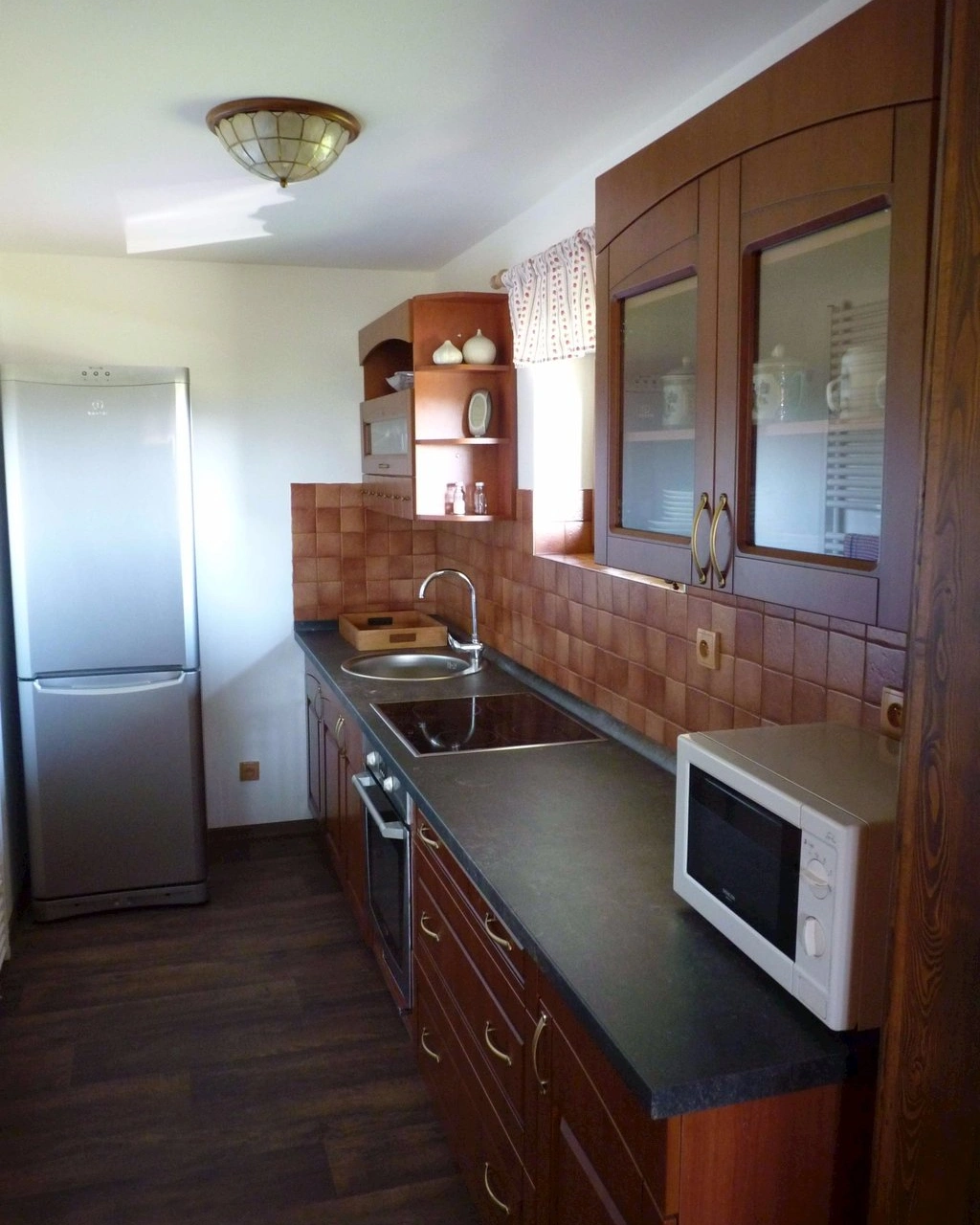 - Kuchyň: keramická varná deska, elektrická trouba, mikrovlnná trouba, lednice s mrazákem, rychlovarná konvice, jídelní posezení.