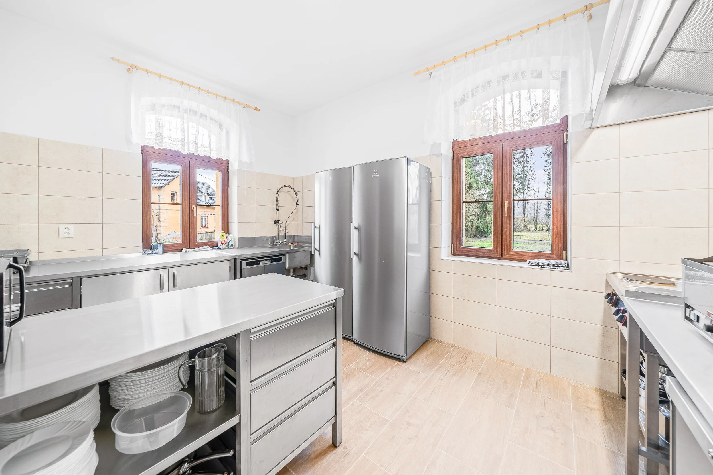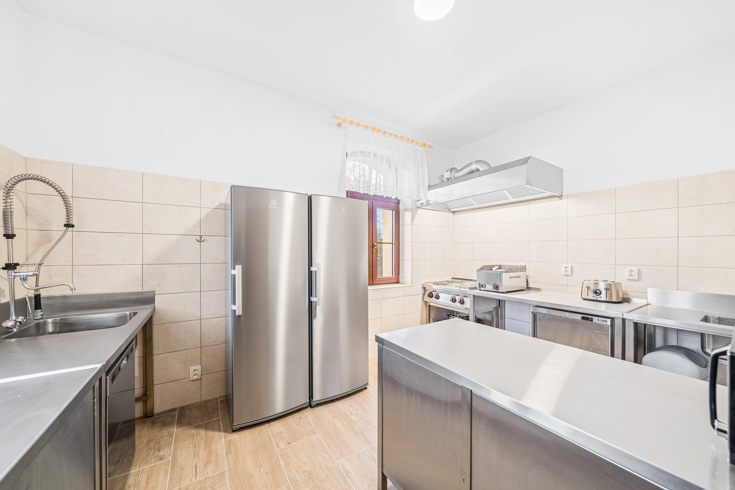 - Profesionálně vybavená kuchyně: velký sporák, trouba, 2 lednice, mikrovlnná trouba, grilovací deska, mrazák, myčka nádobí