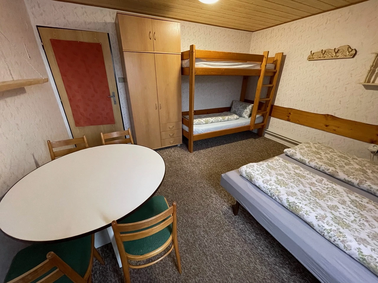 V každém pokoji je jídelní stůl a umyvadlo se studenou vodou.