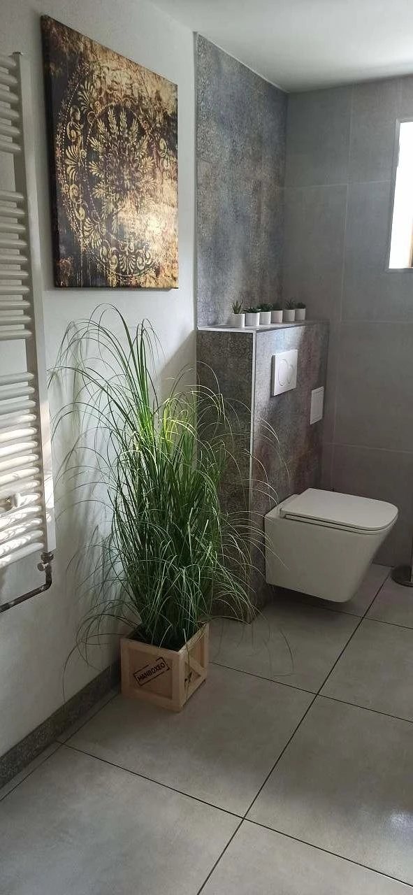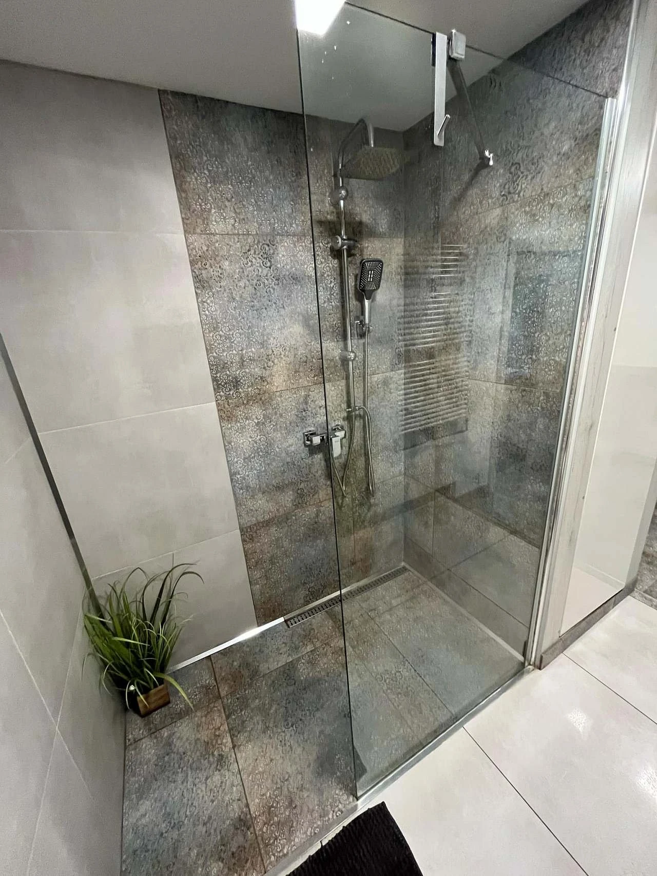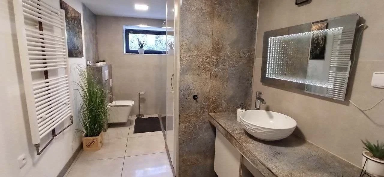 - Koupelna se sprchovým koutem, WC, umyvadlovým pultem, skříňkami, pračkou, sušákem na prádlo
