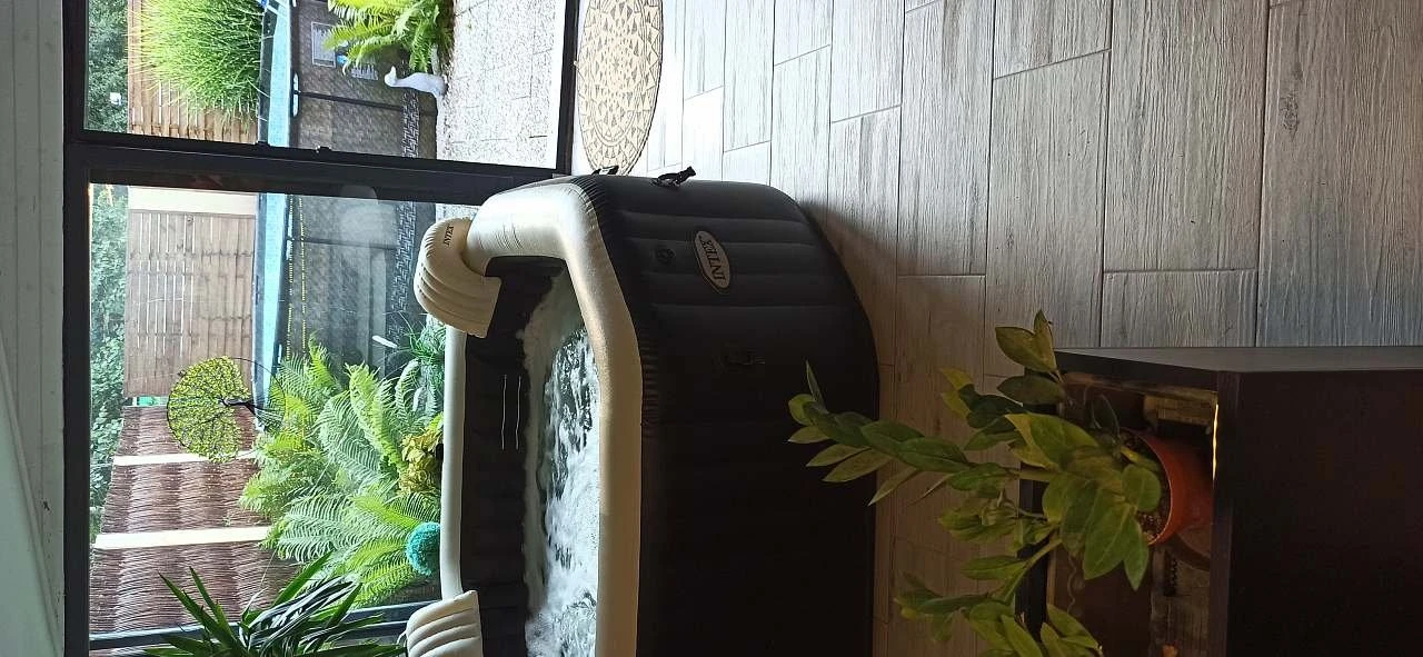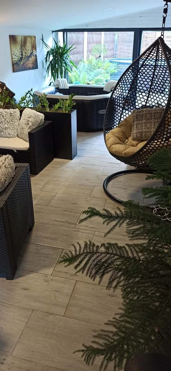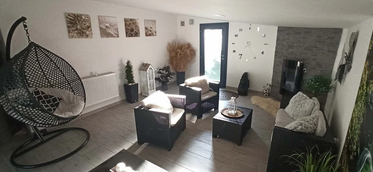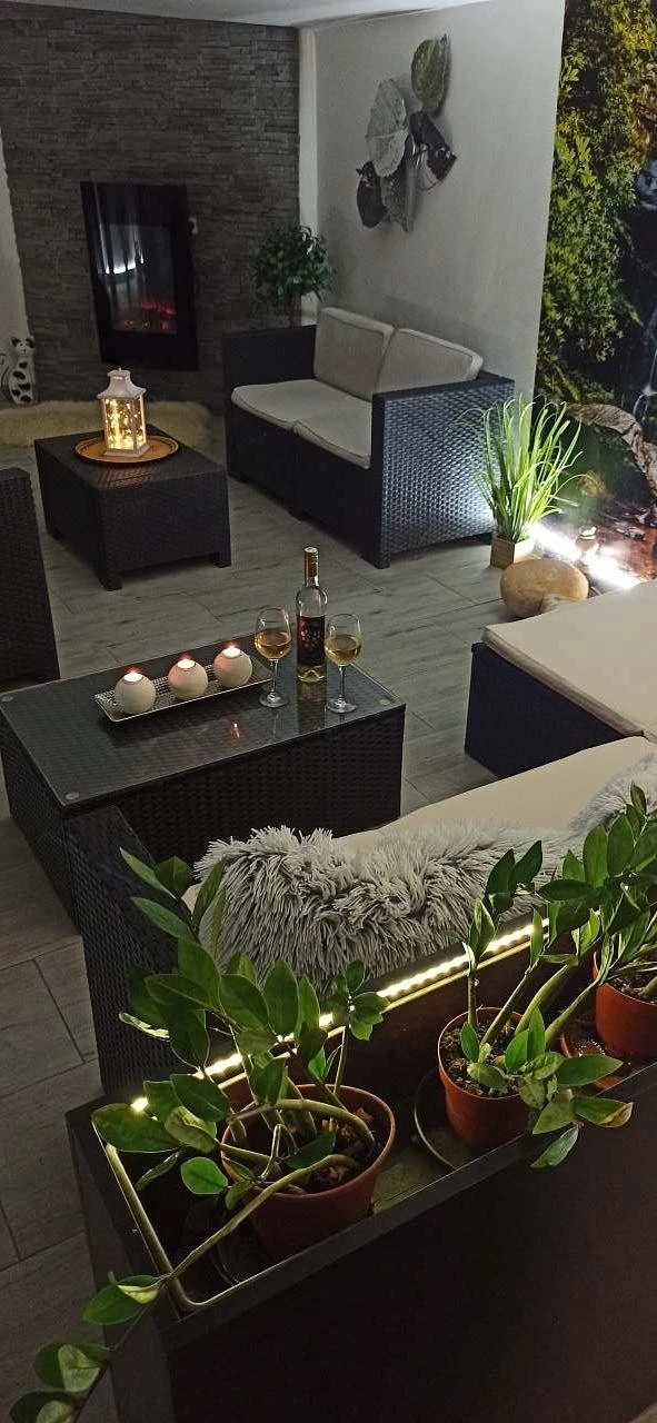 - Vířivka s masážními tryskami, závěsný houpací koš, elektrický krb