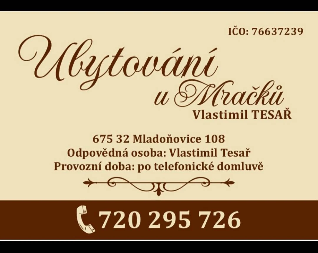 Ubytování u Mračků se nachází v obci Mladoňovice – část Dobrá Voda, okres Třebíč, v regionu Vysočina u hranic s Rakouskem. Nabízí celou samostatnou přízemní část chalupy pro až 6 osob (+1) s 2 ložnicemi a 7 lůžky. K dispozici je parkování přímo u domu, krytá venkovní terasa, venkovní krb s posezením u ohně, vnitřní vířivka a venkovní bazén. Objekt je oplocený, vhodný pro mazlíčky, a nachází se u lesa a u vody, mimo hlavní silnici.