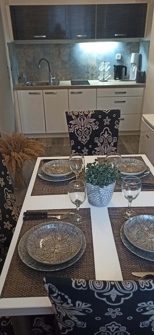 Sociální zařízení zahrnuje koupelnu s umyvadlovým pultem, skříňkami, pračkou, sušákem na prádlo, sprchovým koutem a WC. V technické skříni jsou čisticí prostředky, smeták, lopatka, mop a fén na vlasy.
