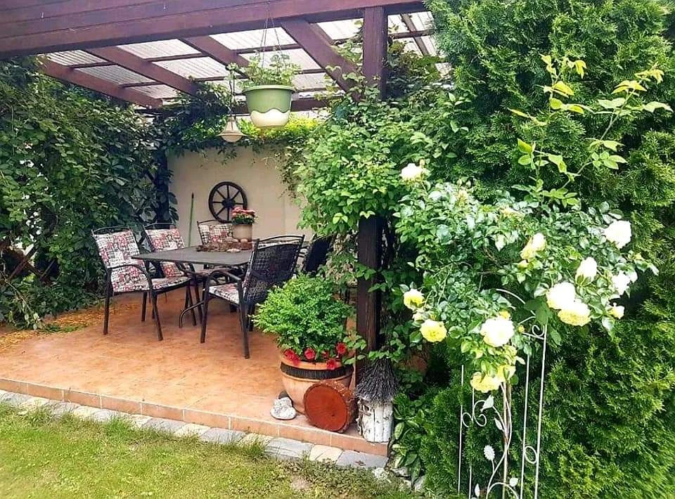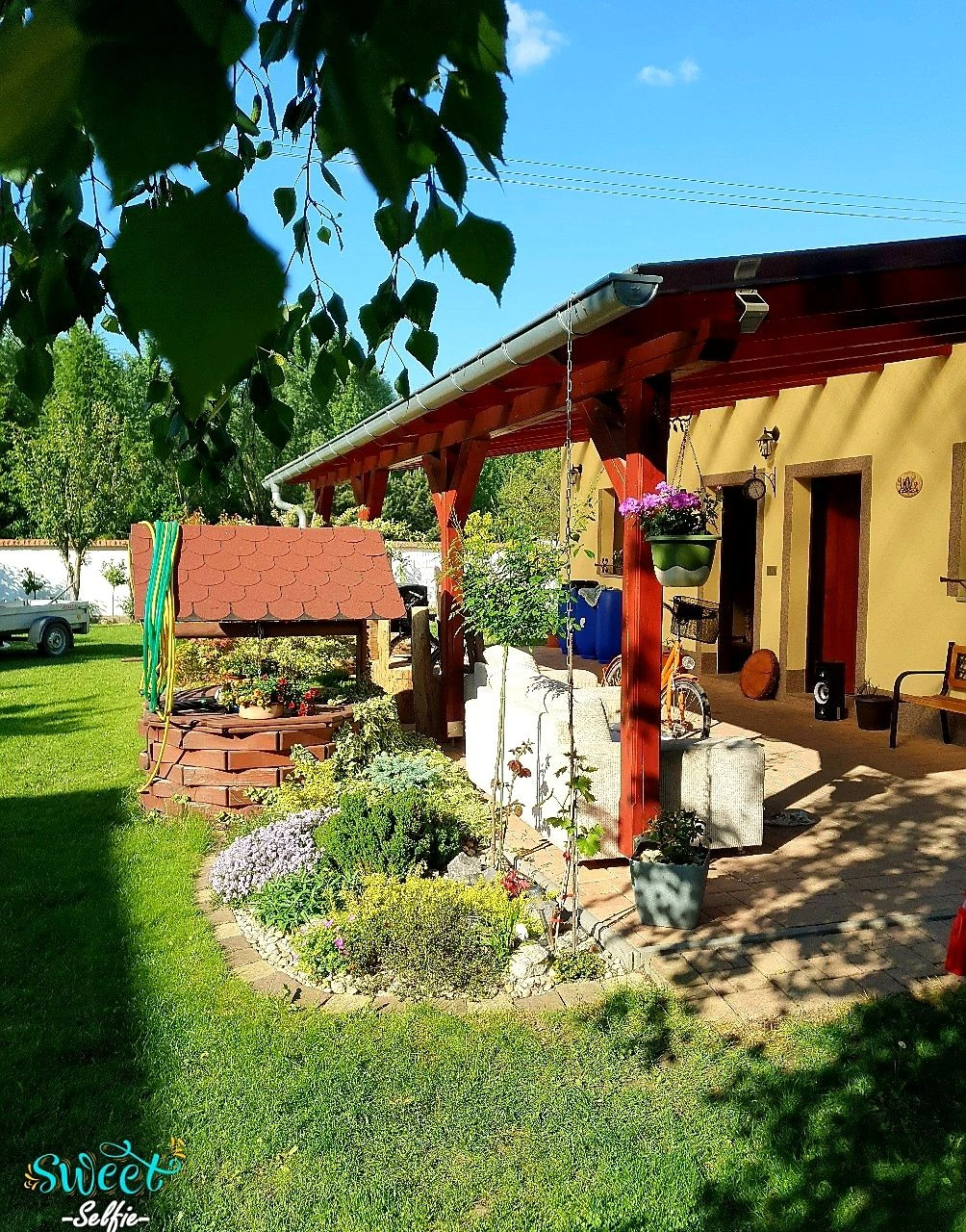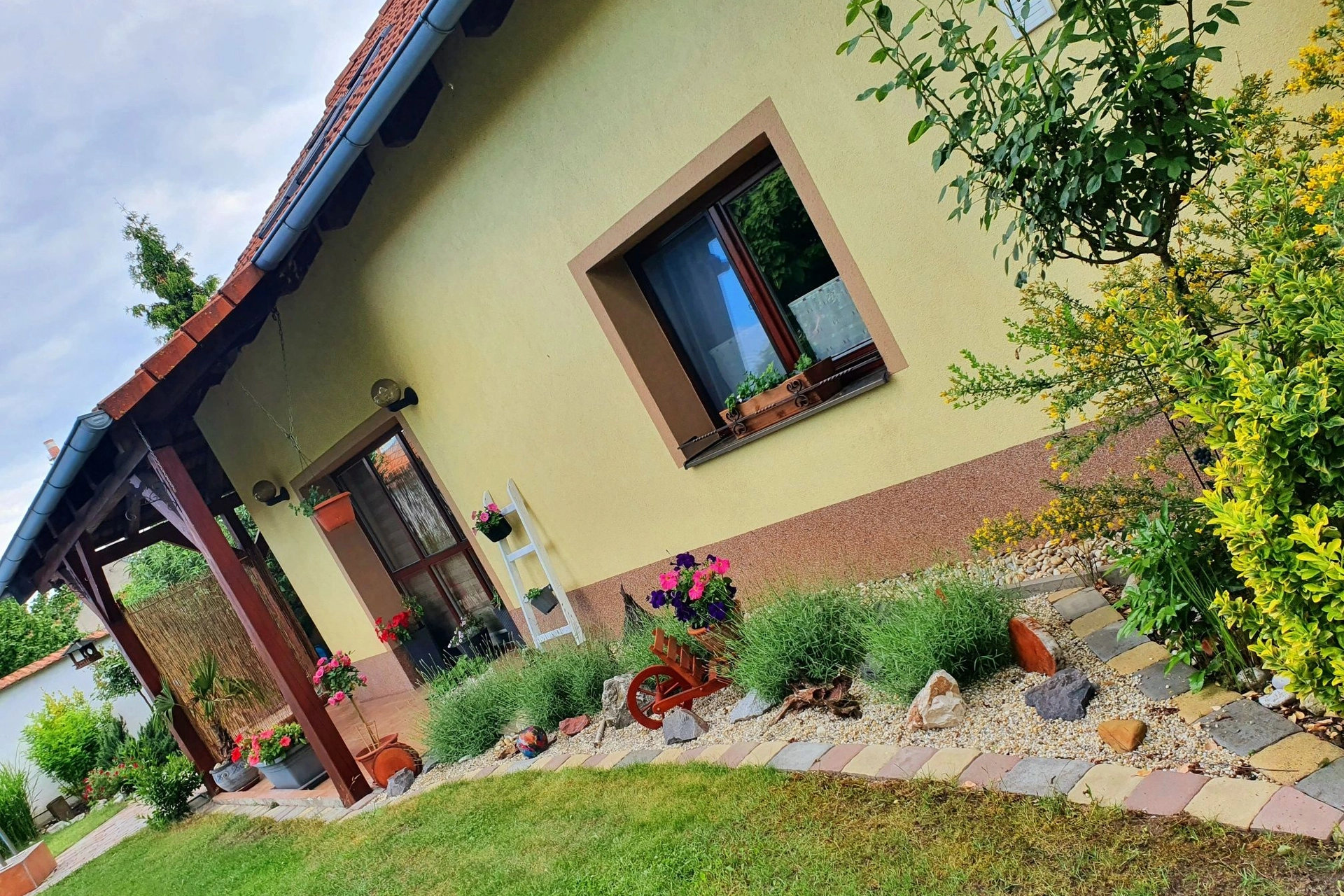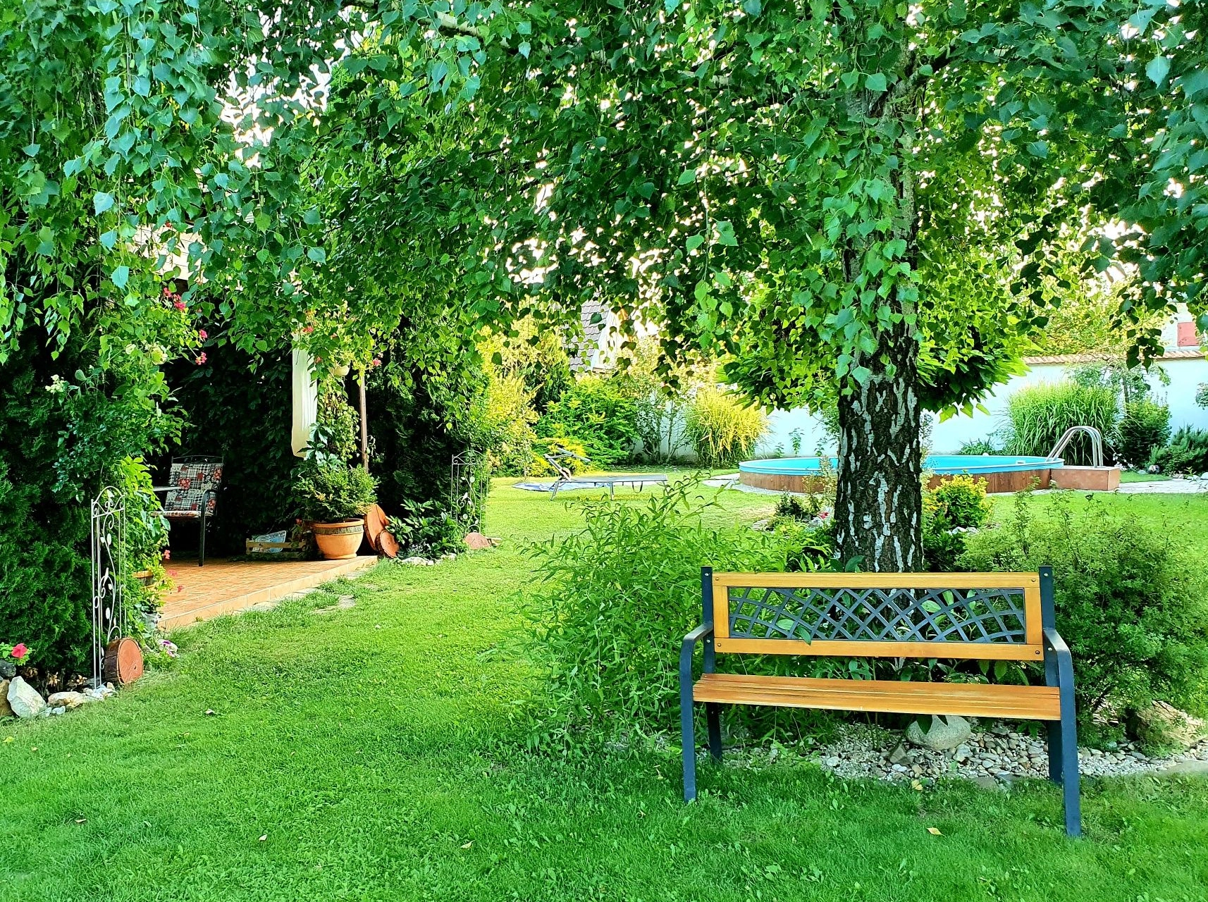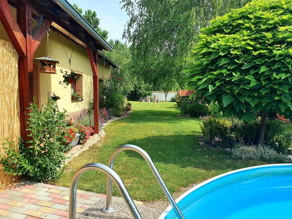 Venkovní prostory zahrnují bazén, terasu s krbem, grilem a ohništěm. Děti mohou využít trampolínu, skluzavku a hračky. K dispozici je úschovna kol a běžek v uzamykatelné místnosti. Objekt má vlastní soukromý vchod a pět parkovacích míst na oploceném pozemku. Domácí zvířata jsou povolena po dohodě s majiteli. V okolí do jednoho kilometru se nachází restaurace.