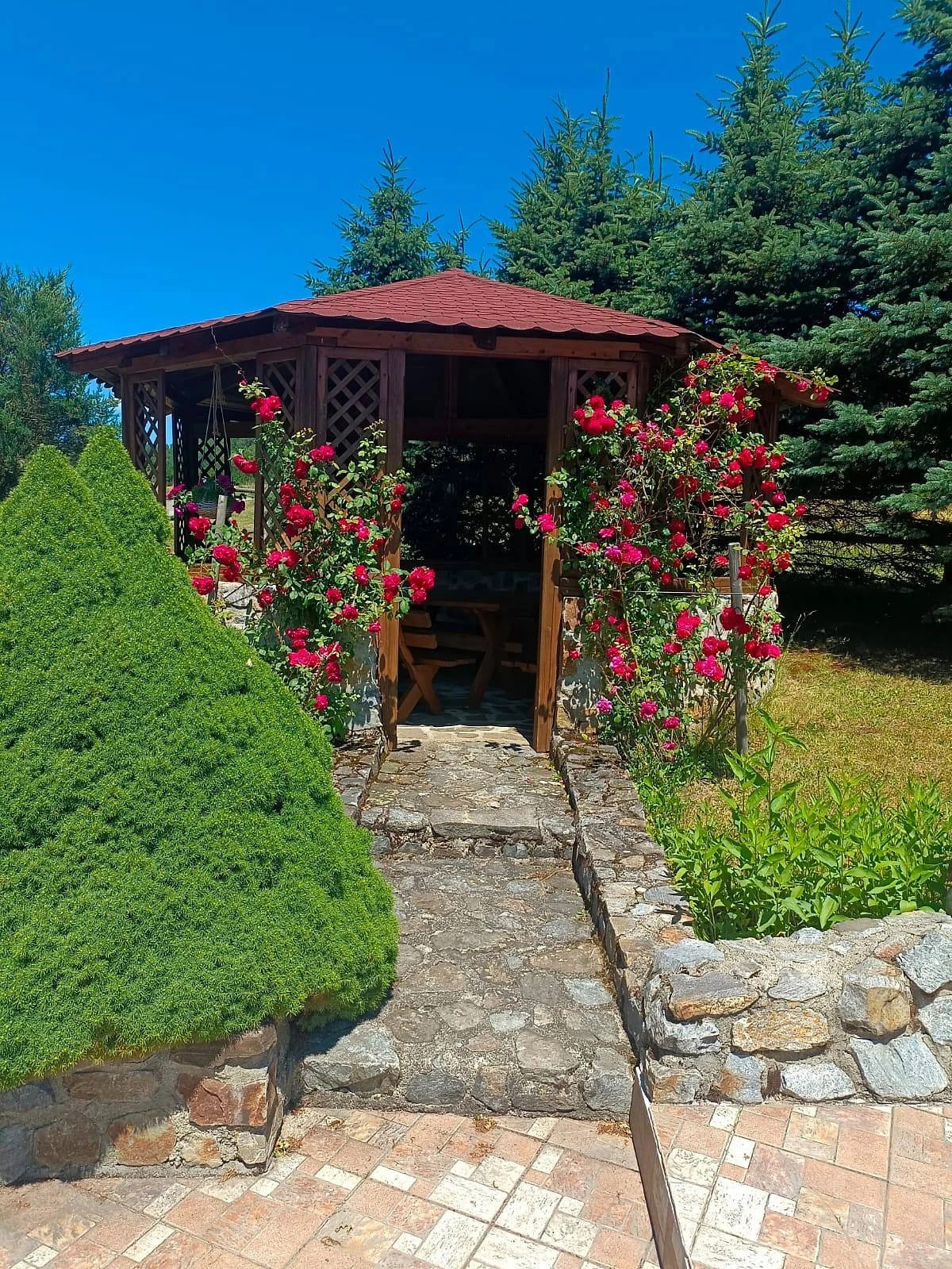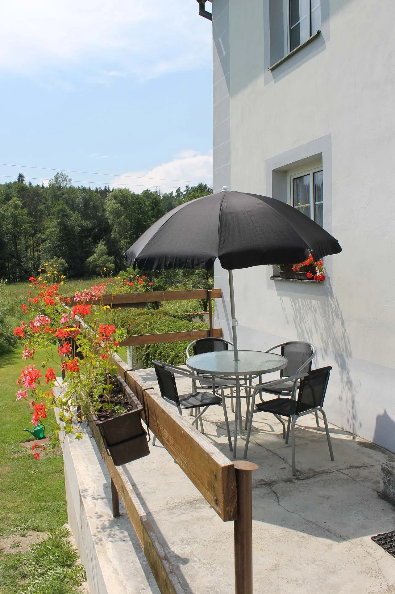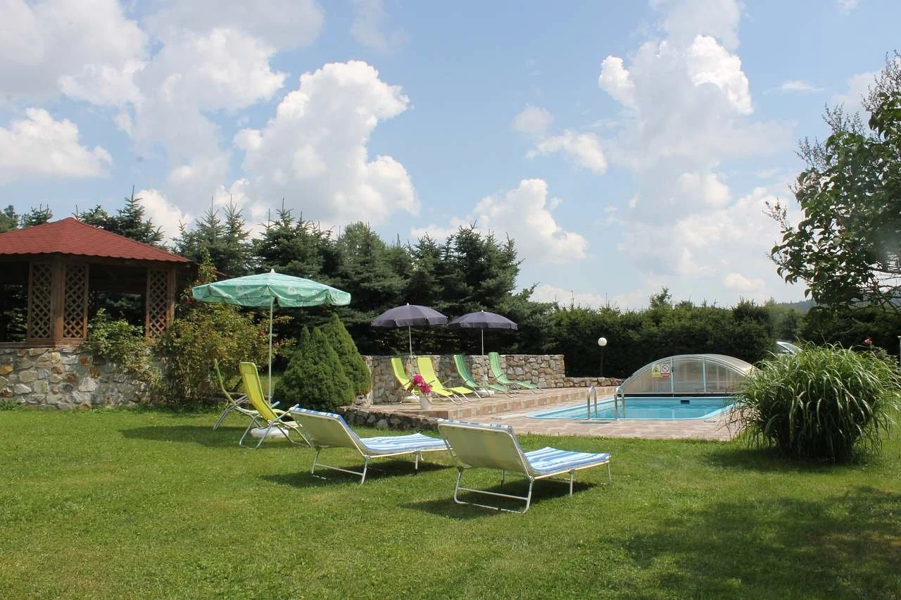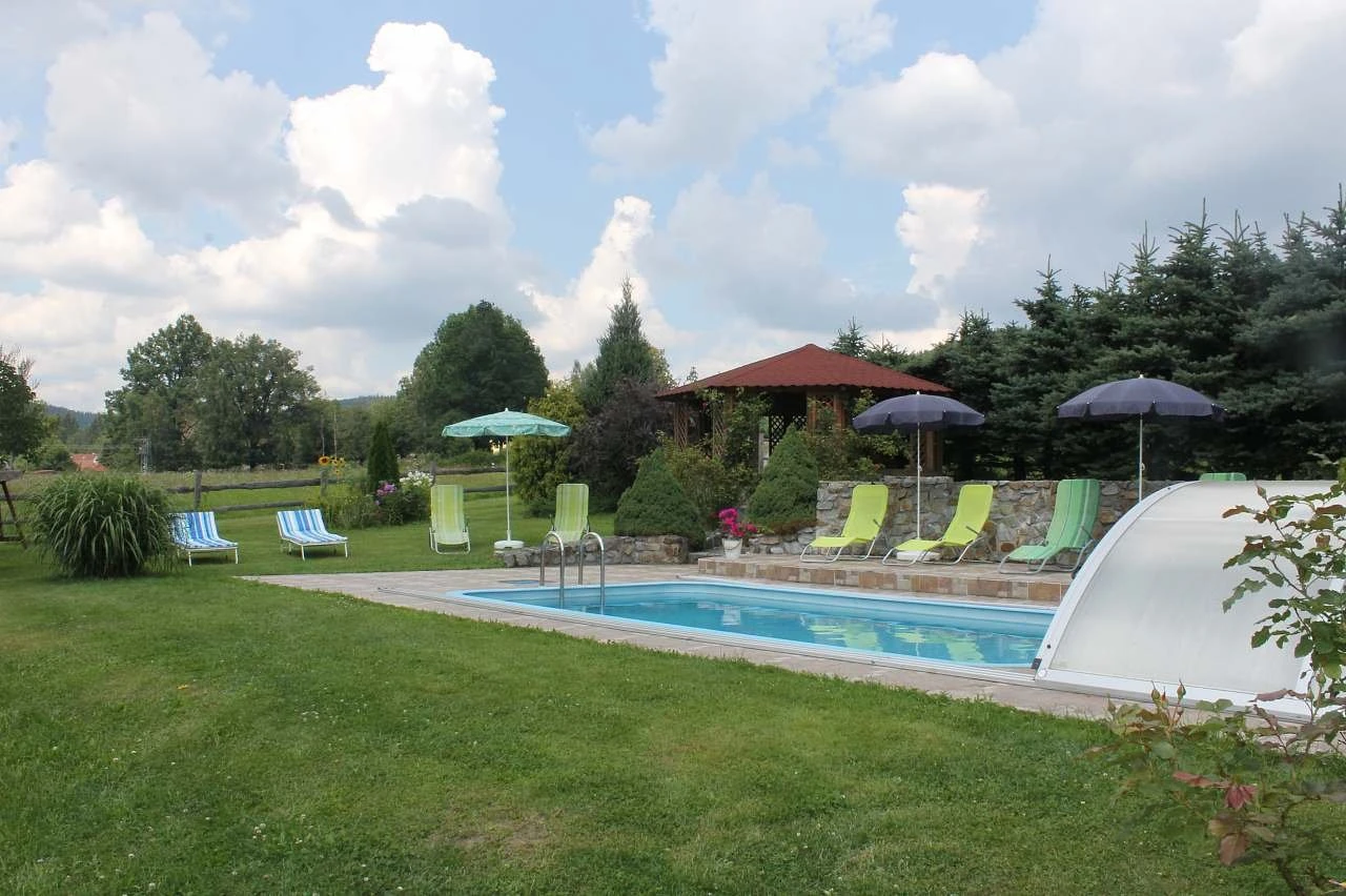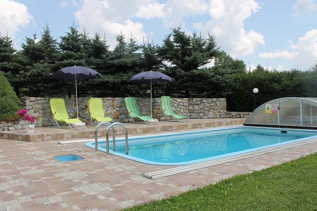 Součástí venkovního prostoru je krytý bazén (3 × 5 m), pergola s grilem, venkovní ohniště a zahradní altán s posezením. K dispozici je také prostorná zahrada a dětský koutek vybavený houpačkami, trampolínou, pískovištěm a dalšími prvky. Nově je možné využít infrasaunu a vířivku, jejich použití je nutné nahlásit předem.