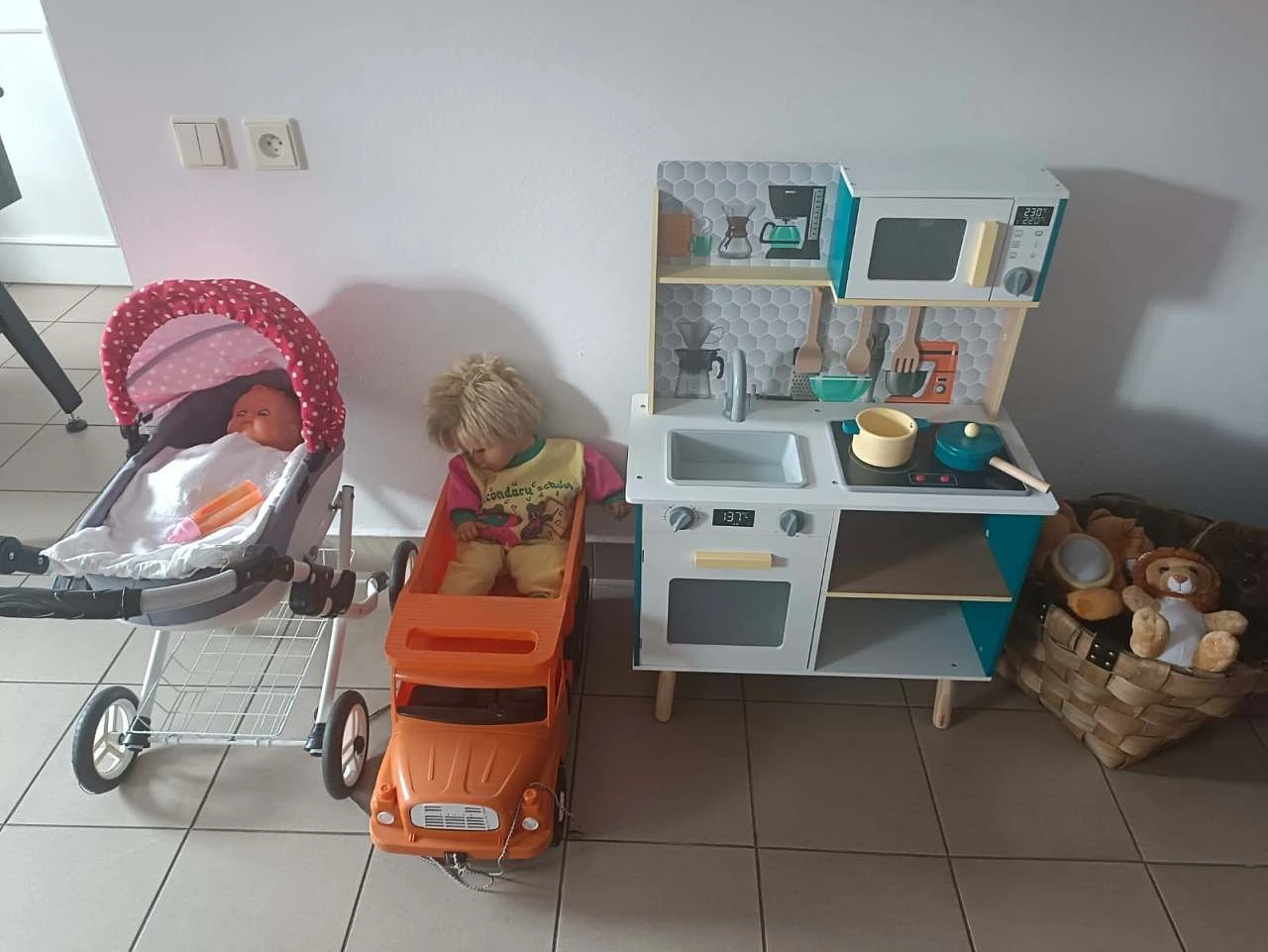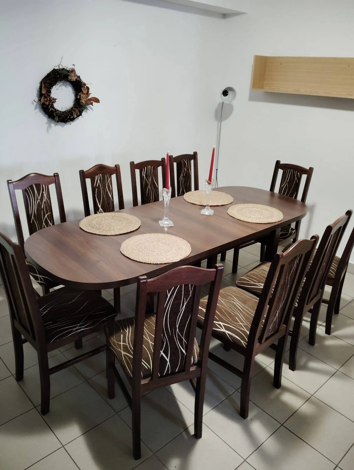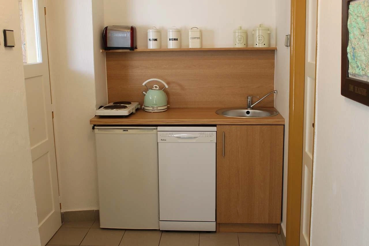 Kuchyň je plně vybavena pro vaření, včetně elektrického sporáku, varné konvice, toustovače, myčky nádobí a lednice s mrazákem. K dispozici je jídelní stůl, židle a základní kuchyňské vybavení.
