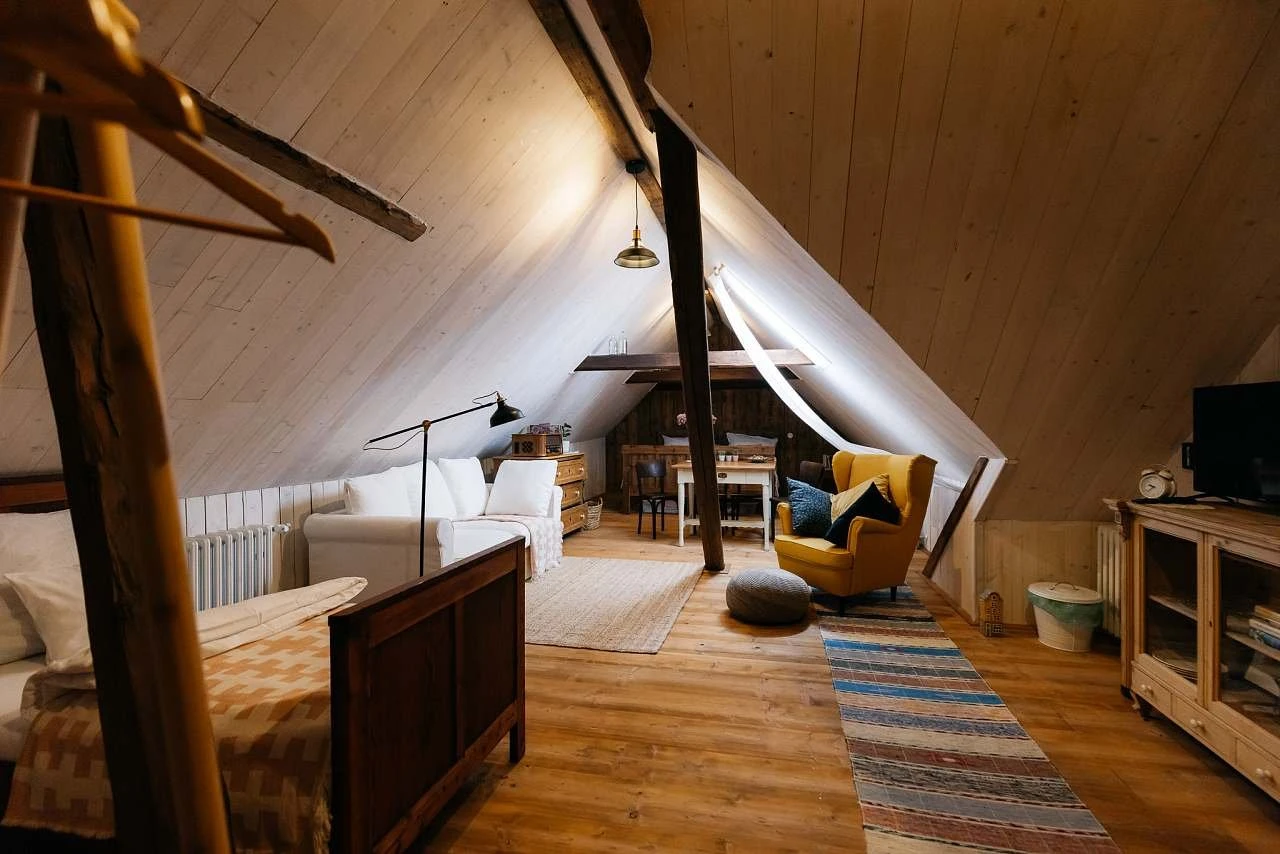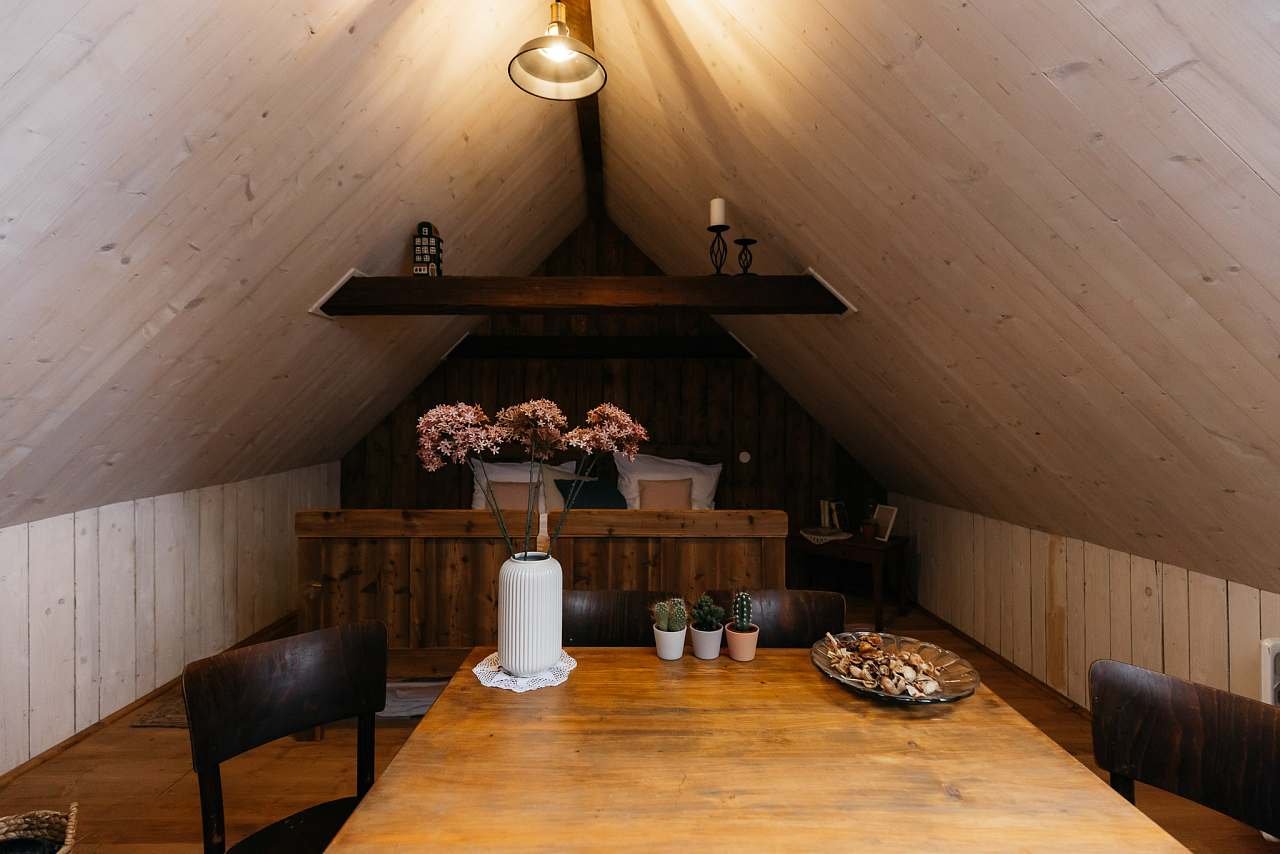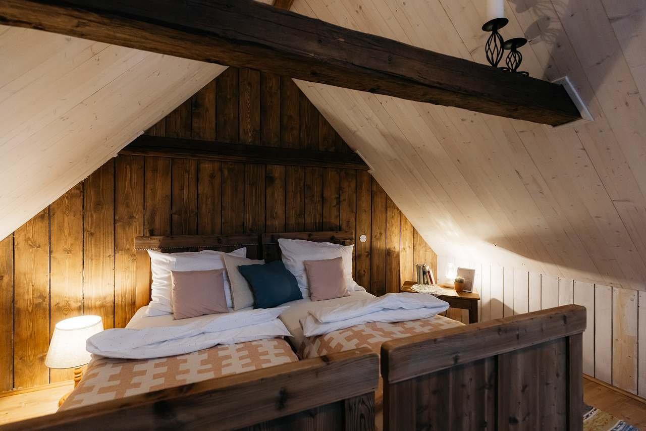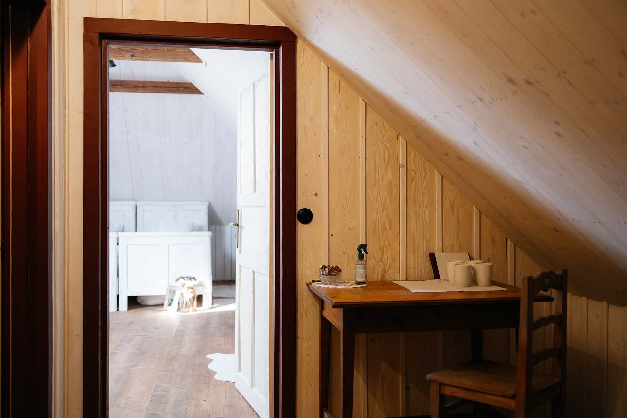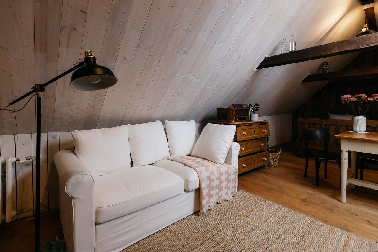 Apartmán Nad vratyKapacita: 6 lůžek + 2 přistýlkyLožnice: 1Vybavení apartmánu:Vstupní chodbaKoupelna se sprchovým koutem a WCSpolečný prostor pro 6 osob (+2 na přistýlce)Historické postele s polštáři a dekamiNoční stoly se lampamiStřešní okna zajišťující přirozené světloDřevěné skříně a komody s dostatkem úložného prostoruMalý stůl se dvěma židlemiKnihy k dispoziciDekorace a styl:Rustikální nábytekRučně vyšívané ubrusy, svíčky, obrázky na stěnáchTeplé barevné odstíny stěn a textiliíKoupelna:Moderní sprchový koutStarožitné prvky a zrcadlo kombinující rustikální a moderní styl