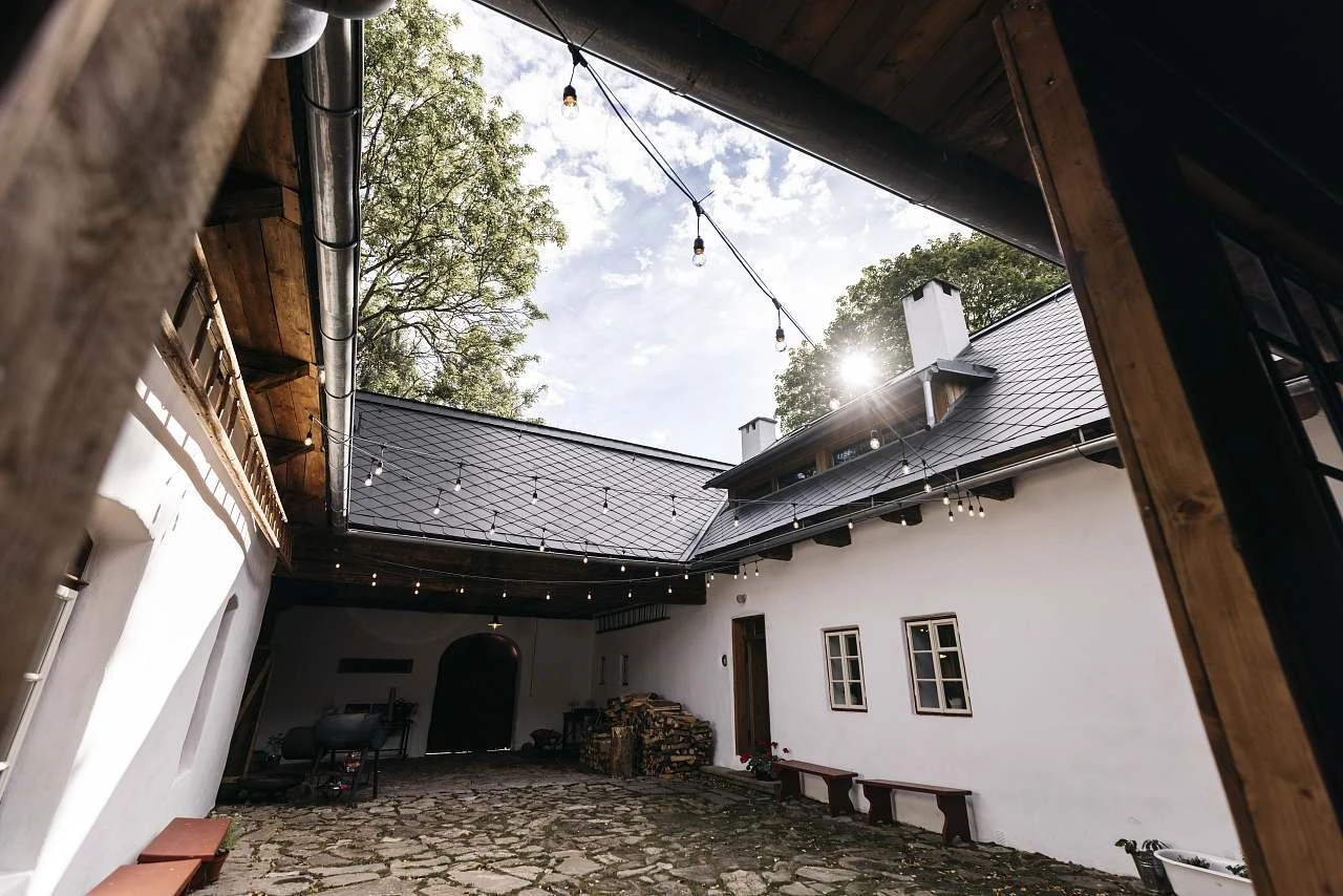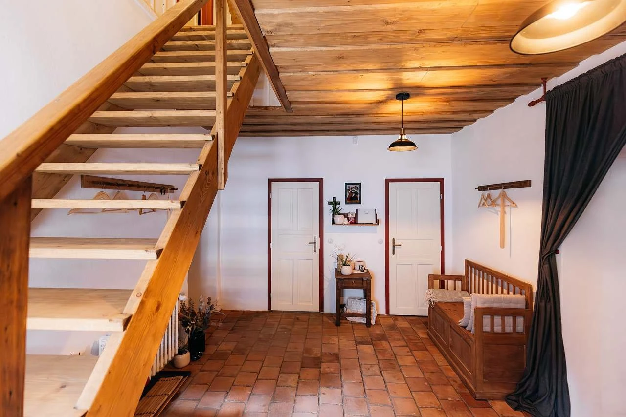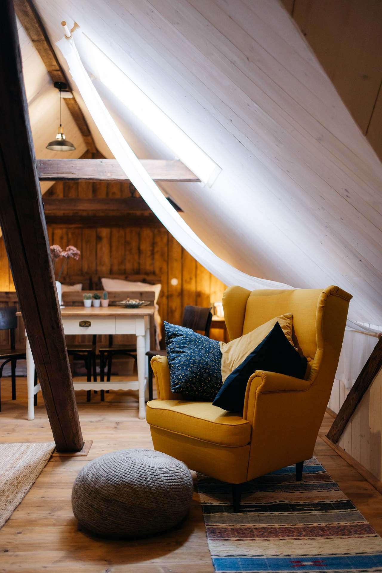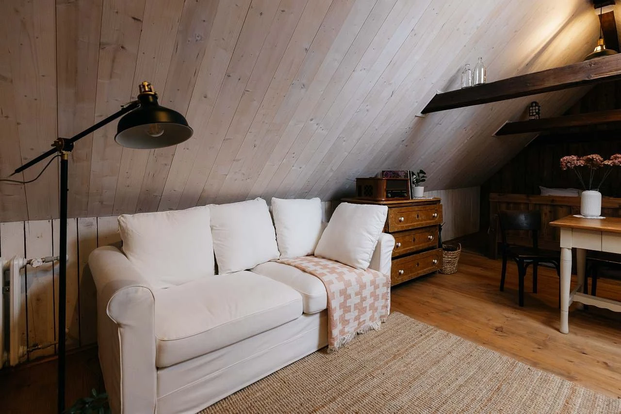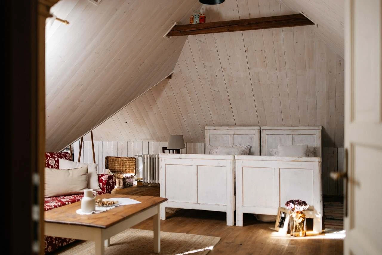 Apartmán Nad vratyKapacita: 6 lůžek + 2 přistýlkyLožnice: 1Vybavení apartmánu:Vstupní chodbaKoupelna se sprchovým koutem a WCSpolečný prostor pro 6 osob (+2 na přistýlce)Historické postele s polštáři a dekamiNoční stoly se lampamiStřešní okna zajišťující přirozené světloDřevěné skříně a komody s dostatkem úložného prostoruMalý stůl se dvěma židlemiKnihy k dispoziciDekorace a styl:Rustikální nábytekRučně vyšívané ubrusy, svíčky, obrázky na stěnáchTeplé barevné odstíny stěn a textiliíKoupelna:Moderní sprchový koutStarožitné prvky a zrcadlo kombinující rustikální a moderní styl