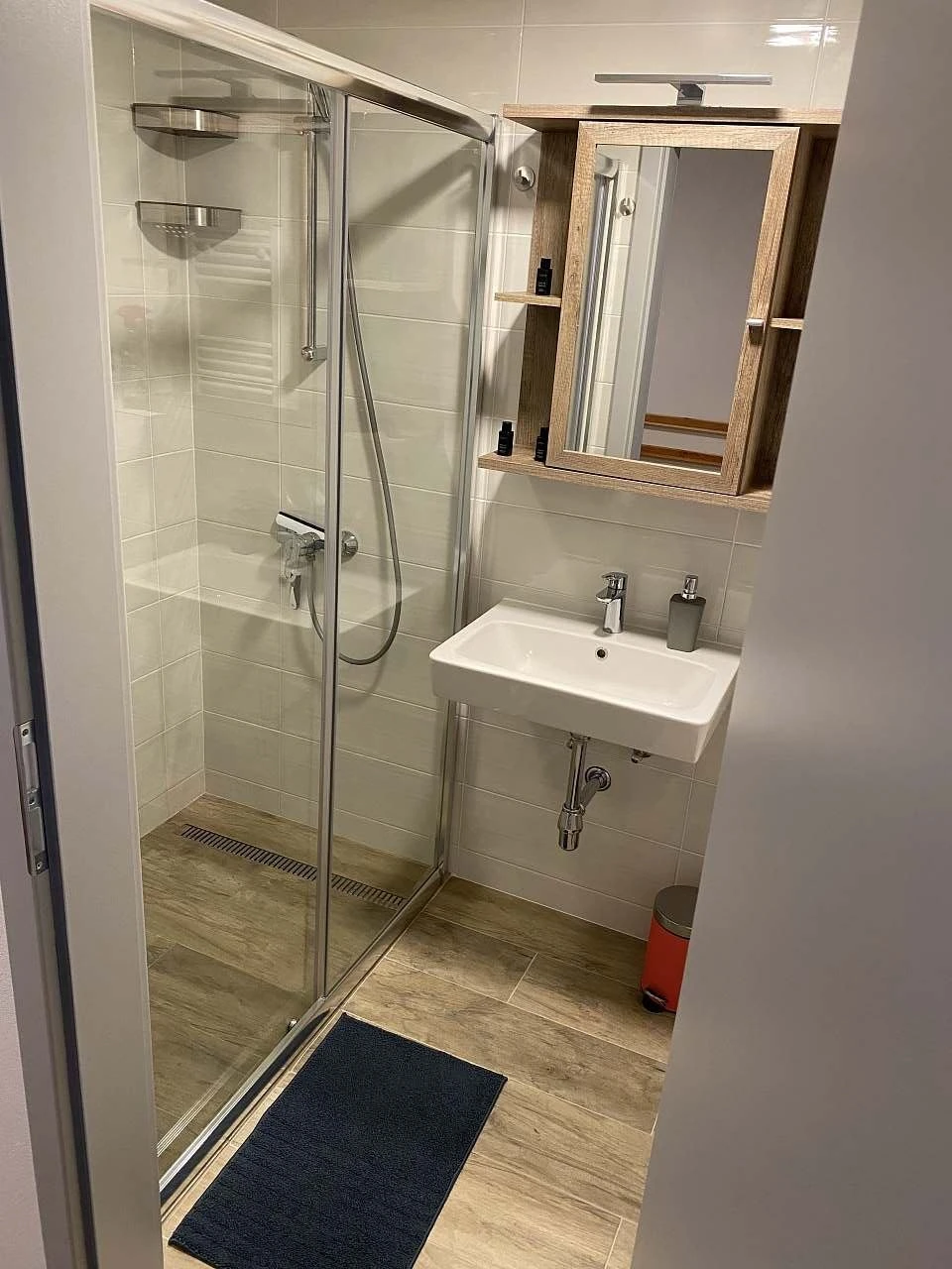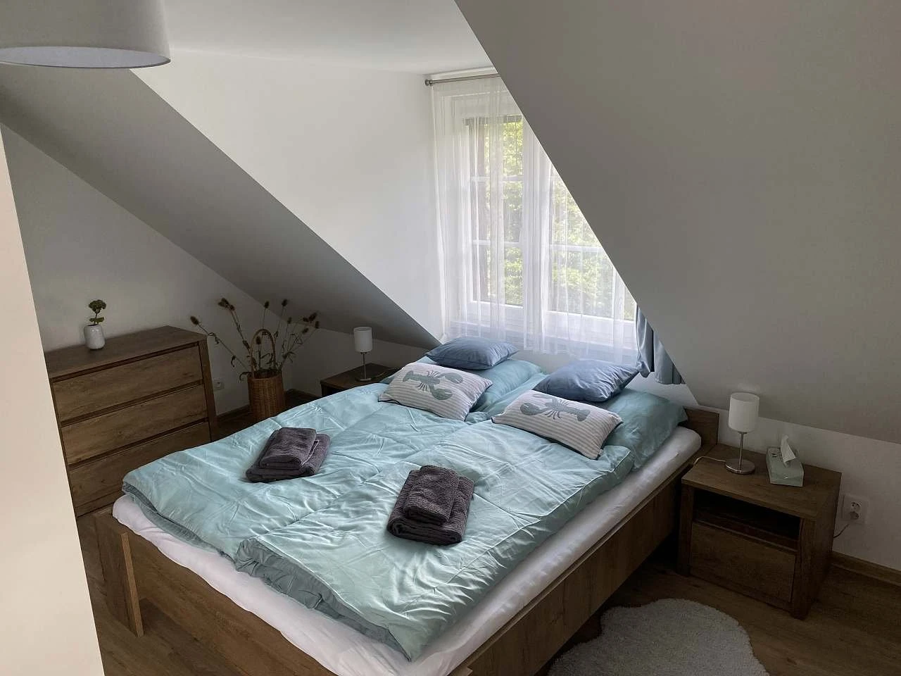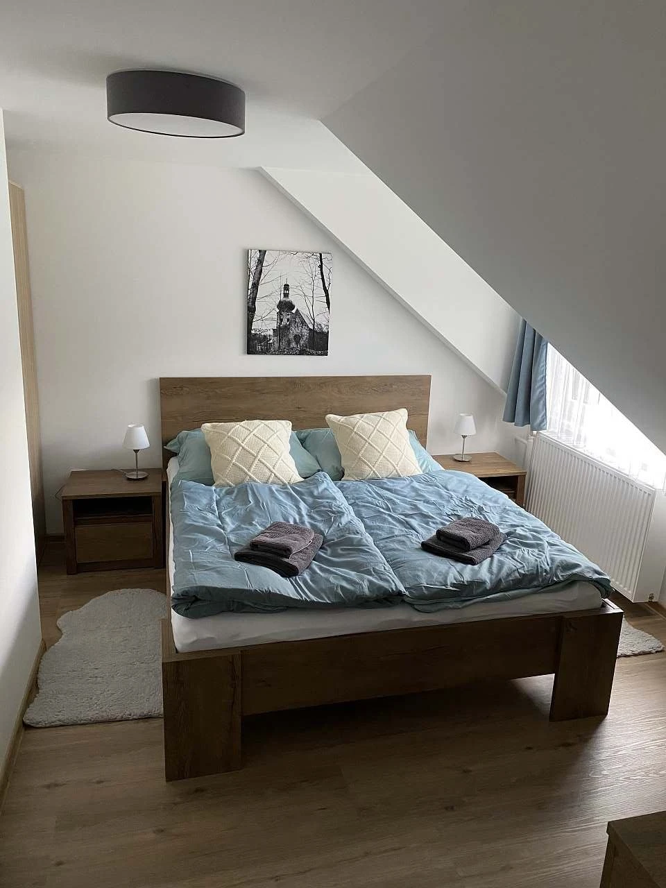 Kapacita: 2 lůžka + 1 přistýlkaPočet ložnic: 1Vybavení pokoje:2 oddělitelné posteleRozkládací pohovka se stolkemTelevizeKoupelna se sprchovým koutemUmístění: Pokoj situován do stínu lesa a směrem na příjezdovou komunikaci a parkovištěUrčení: Optimální pro 2 osoby, vhodný pro aktivní hosty, kteří potřebují klidný spánekSdílená kuchyň:Lednice, myčka, pračkaAutomat na kávu Dolce Gusto (kapsle k zakoupení)Stůl se židlemi ke konzumaci vlastních pokrmůPoužití kuchyně do 22:00 z důvodu nočního kliduKategorie: Jednodušší vybavení odpovídající turistické třídě