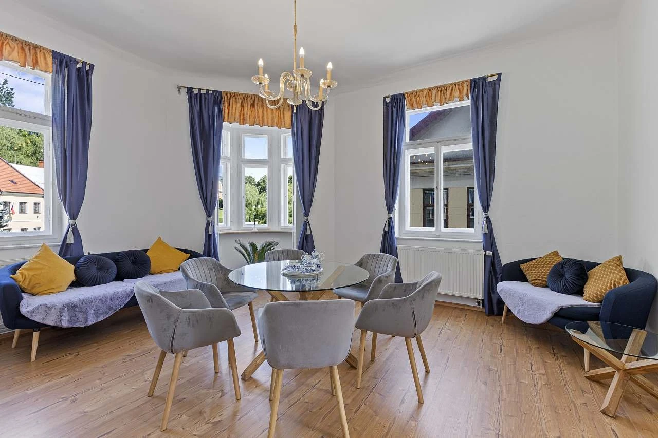 - Obývací prostor: velký obývací pokoj s výhledem na zámek